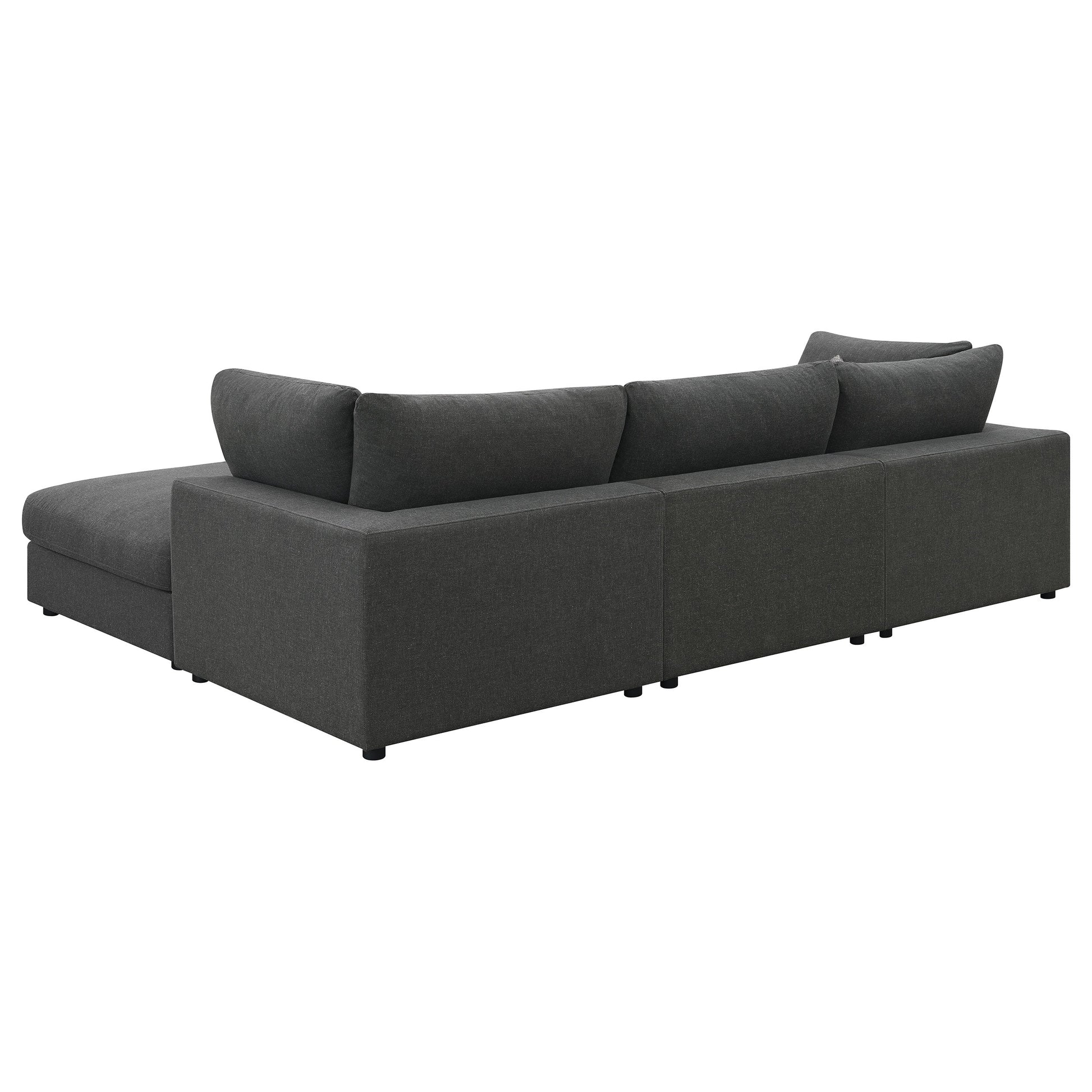 Este sofá modular contemporáneo de cuatro piezas ofrece un versátil diseño en forma de L que combina con innumerables estilos de sala. Envuelto en una tela similar al lino, este sofá modular ofrece toda la comodidad necesaria para relajarse. Los cojines reversibles del respaldo y los cojines decorativos de jacquard invitan a relajarse para una siesta o charlar con invitados. Sus pequeñas patas negras le dan un toque sutil, definiendo su silueta afelpada. Coloque este sofá modular, informal y a la vez elegante, en una sala de entretenimiento familiar para un remanso de paz.