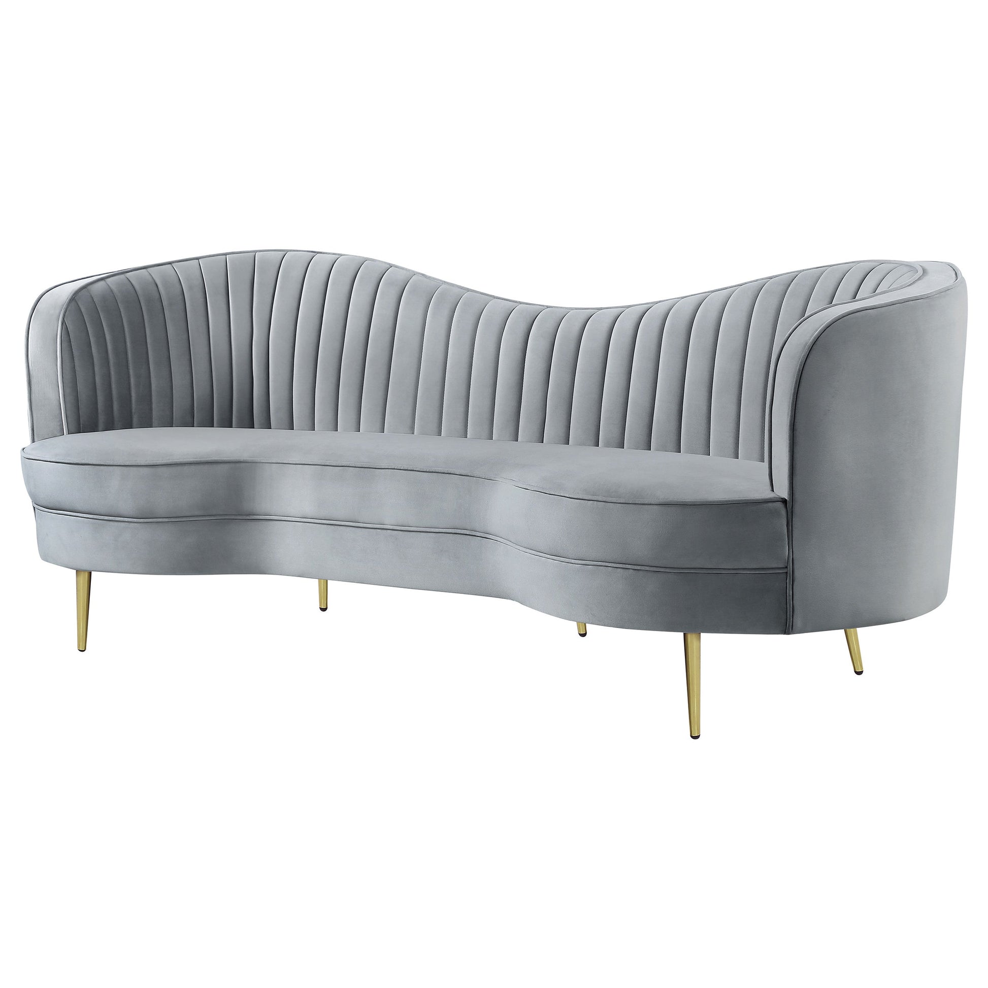 Con un toque Art Déco, este sofá de inspiración retro ofrece una llamativa silueta curvilínea con una tela de colores vibrantes. Envuelto íntegramente en terciopelo azul brillante, ultrasuave al tacto, este sofá contemporáneo se convierte en la pieza central de su sala de estar. Con cojines interiores capitoné y un cojín de banco en forma de riñón, este sofá de inspiración esmoquin le da un giro a un estilo icónico y atemporal. Su silueta de camello invertido con brillantes patas cónicas doradas le confiere un toque de mediados de siglo. Complete su conjunto con un loveseat y una silla con forma de barril a juego.