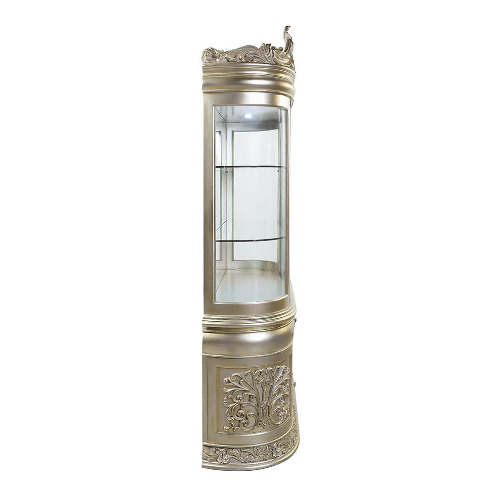 Cree un punto focal funcional y opulento con el gabinete de curiosidades Sorina, un mueble majestuoso, encantador y accesible. Con acabados en oro y plata, el gabinete brilla con un toque de glamour, con un panel trasero de espejo y una corona superior. Tras las dos puertas de vidrio con marco de madera se encuentran dos estantes de vidrio que ofrecen amplio espacio para exhibir y guardar todas sus posesiones más preciadas.