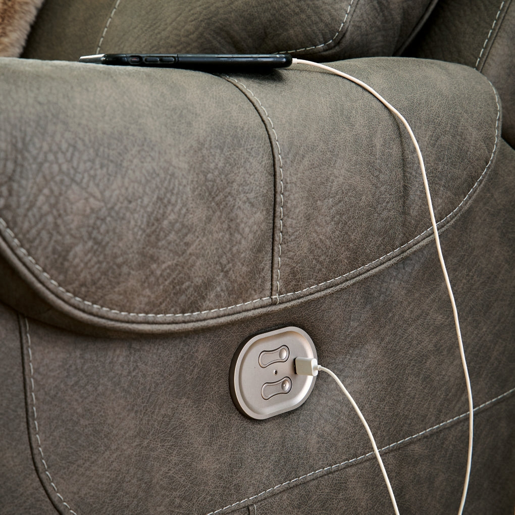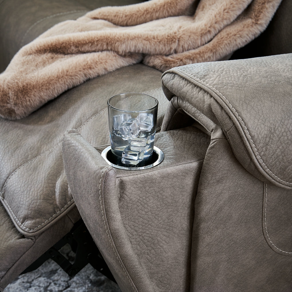 Destination: chic comfort. This power reclining sofa launches your living room into superior form with stellar attention to detail. Exemplifying attainable luxury, its handsome hue has an air of sophistication youÕll long to lounge in. And when youÕre done basking in the glow of its sleek style, recline with indulgent motion features to welcome head-to-toe relaxation.