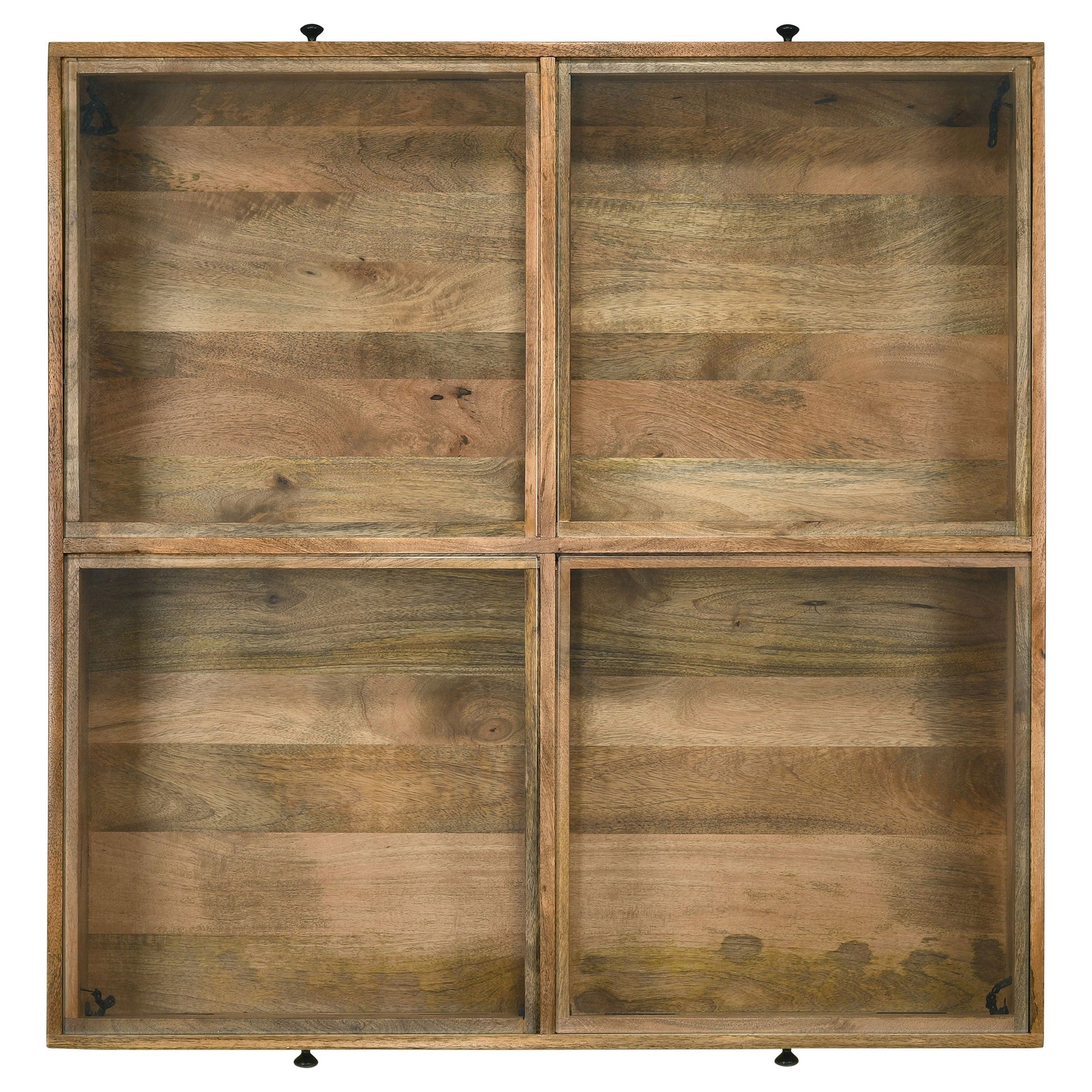 Dale un toque rústico a tu sala de estar con esta mesa de centro con compartimentos de sombra. Su tablero de vidrio templado ofrece una vista clara de los tesoros guardados en cuatro compartimentos, a los que se accede mediante puertas abatibles con cadena que le dan un toque único. Elaborada en madera maciza de mango con un cálido acabado marrón miel, irradia calidez natural. Una robusta base de hierro y detalles de metal negro completan su estilo de técnica mixta, convirtiendo esta mesa en un punto focal personalizado y funcional.