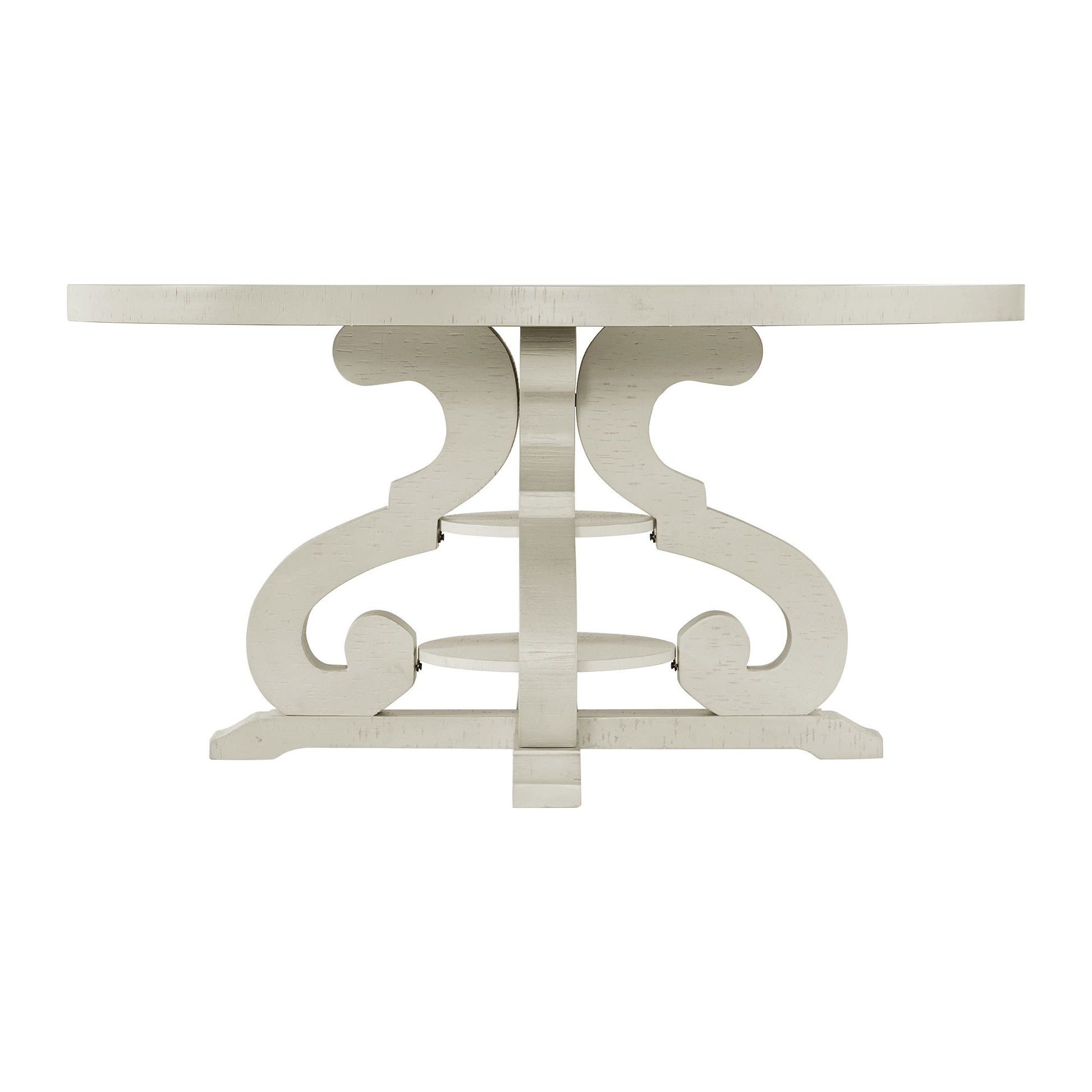 The Stone Round Dining Table is the perfect addition to your dining room! This round dining table features an intricate trestle base, a great update to a classic table. The table is finished in white and features distressed markings throughout. This table's transitional design ensures it'll be a great fit for your home with any existing decor or furnishings you might have. The Stanford Round Dining Table can easily sit up to six guests, ideal for any last minute get-togethers.