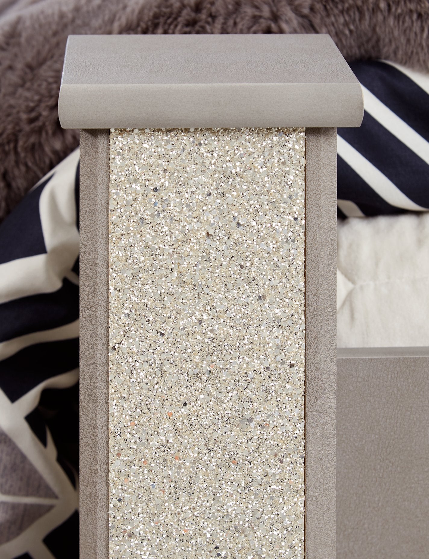 ¿Te encanta el estilo contemporáneo, elegante y audaz? Sumérgete en la belleza de esta cama queen con paneles. Sus llamativos detalles incluyen un acabado de cuero granulado, glamurosos detalles de brillo e iluminación LED con control remoto. Combinada con su estética minimalista, es una forma sencillamente espectacular de lograr el dormitorio de tus sueños.