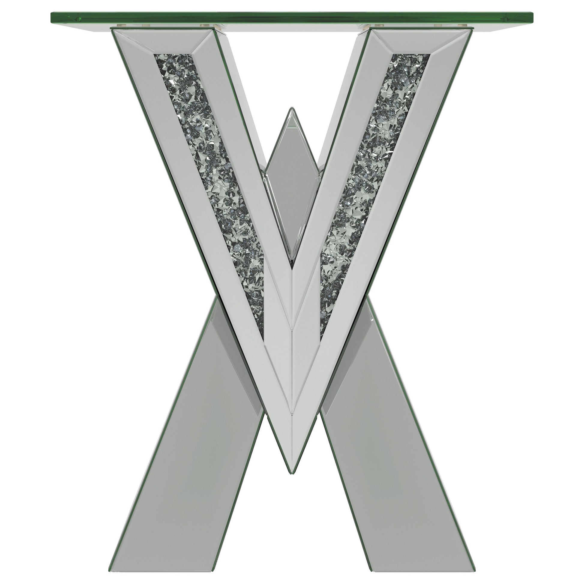 Esta mesa auxiliar con espejo aporta un toque audaz y artístico a cualquier espacio. Su llamativa base en forma de V presenta paneles de espejo y brillantes detalles de cristal, creando un diseño glamuroso y reflexivo. Con una superficie cuadrada y biselada de vidrio templado, esta pieza combina a la perfección estilo y funcionalidad. Su silueta escultural la convierte en un punto focal para interiores modernos.