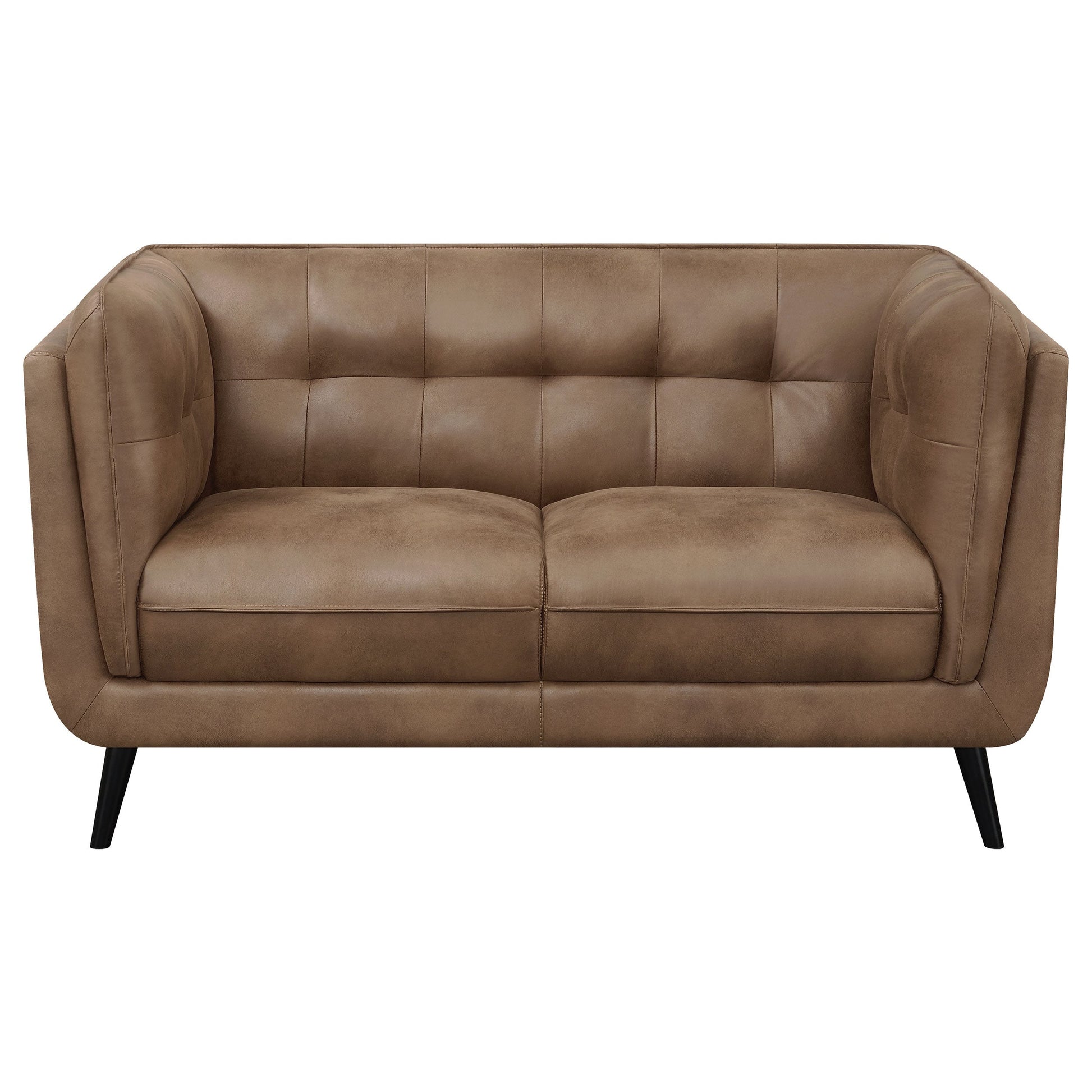 Reciba a sus invitados en su sala de estar contemporánea con este moderno conjunto de asientos de estilo refugio de mediados de siglo, con lujosos respaldos capitoné de rejilla y cojines tapizados en suave microfibra marrón de alto rendimiento para una comodidad suprema. Esta colección de sala de estar tapizada contemporánea de inspiración retro presenta estructuras clásicas de estilo Chesterfield, acentuadas con detalles de ribetes y patas cónicas de madera marrón oscuro que le dan un toque vintage y elegante.