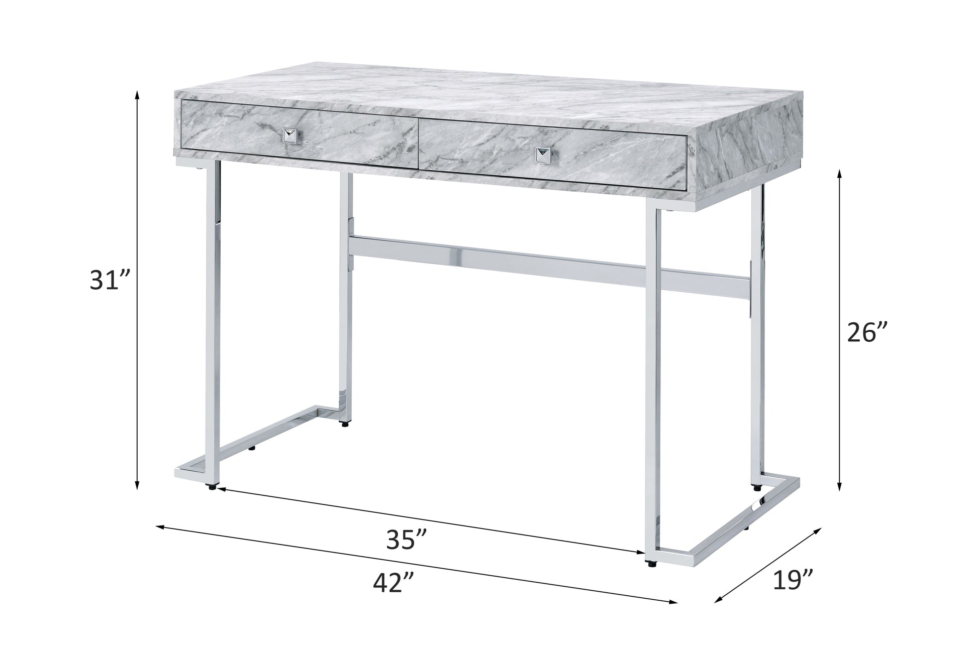 Dale un toque elegante y minimalista a tu espacio de trabajo, donde pasas ocho horas al día. El escritorio presenta un diseño moderno y glamoroso con una cubierta de imitación mármol blanco y una estructura cromada brillante. Su base metálica de trineo presenta elegantes líneas rectas que le dan un aire abierto y espacioso, dándole un aspecto sencillo y elegante. La cubierta de imitación mármol blanco luce texturas naturales y cuenta con dos cajones para guardar tus suministros de oficina.