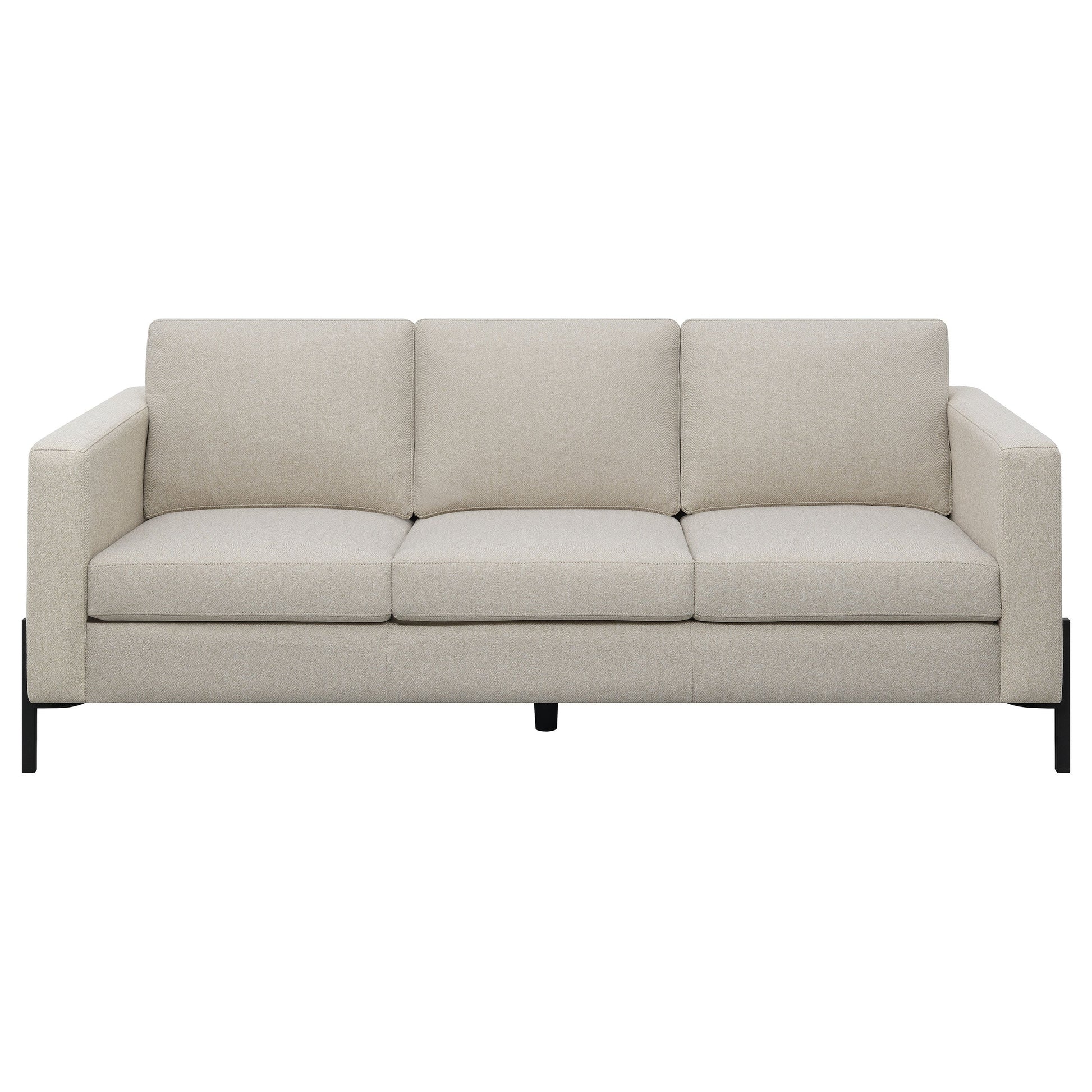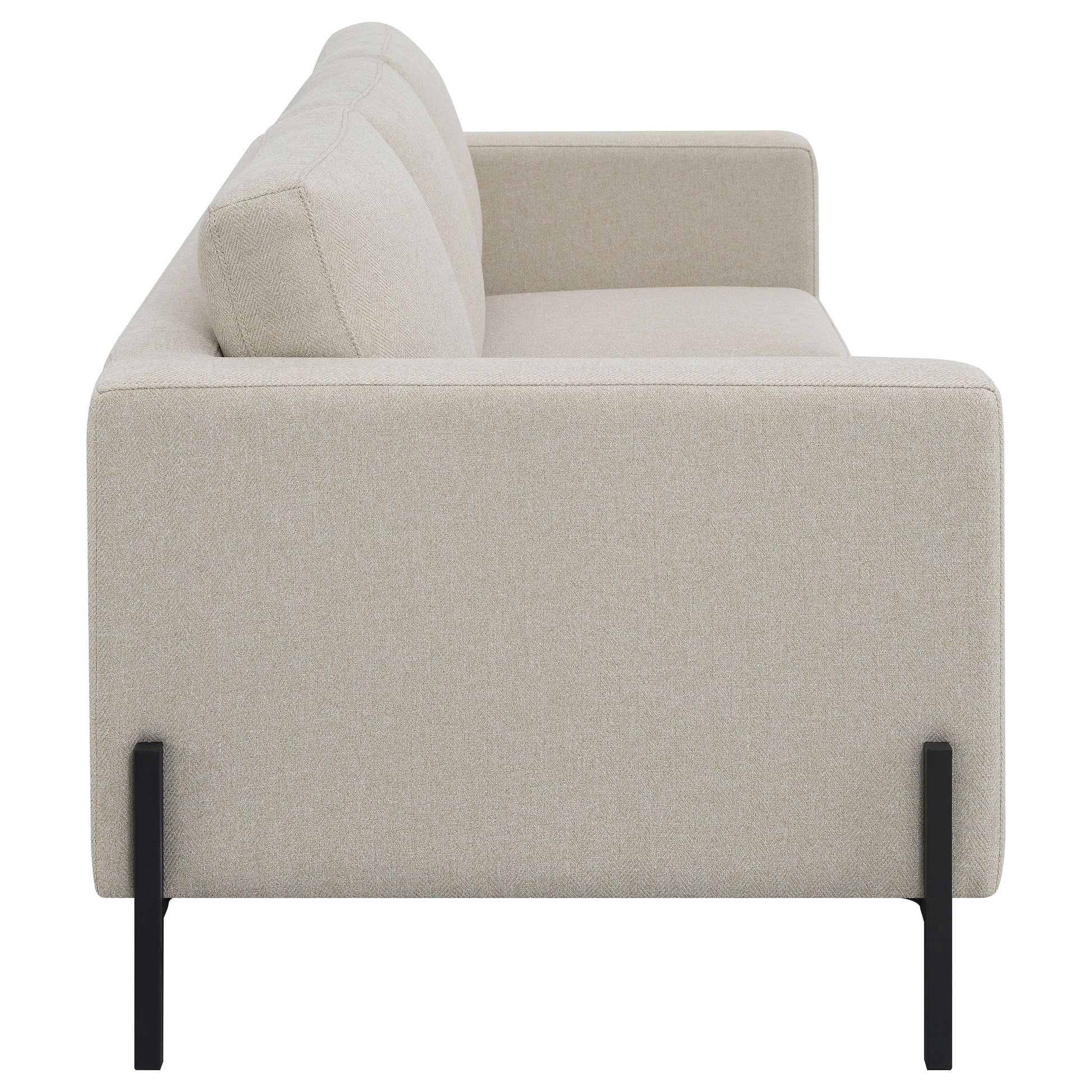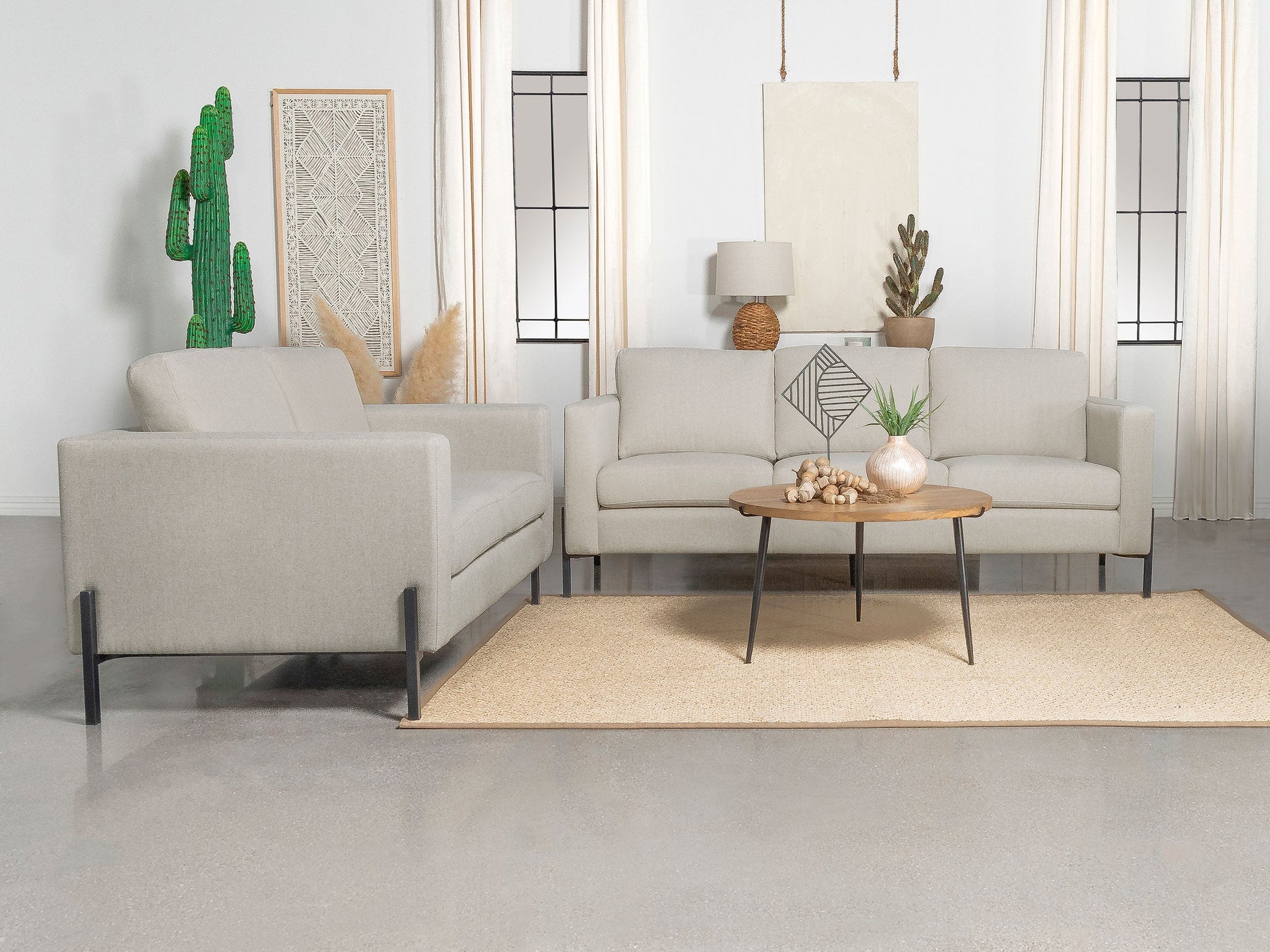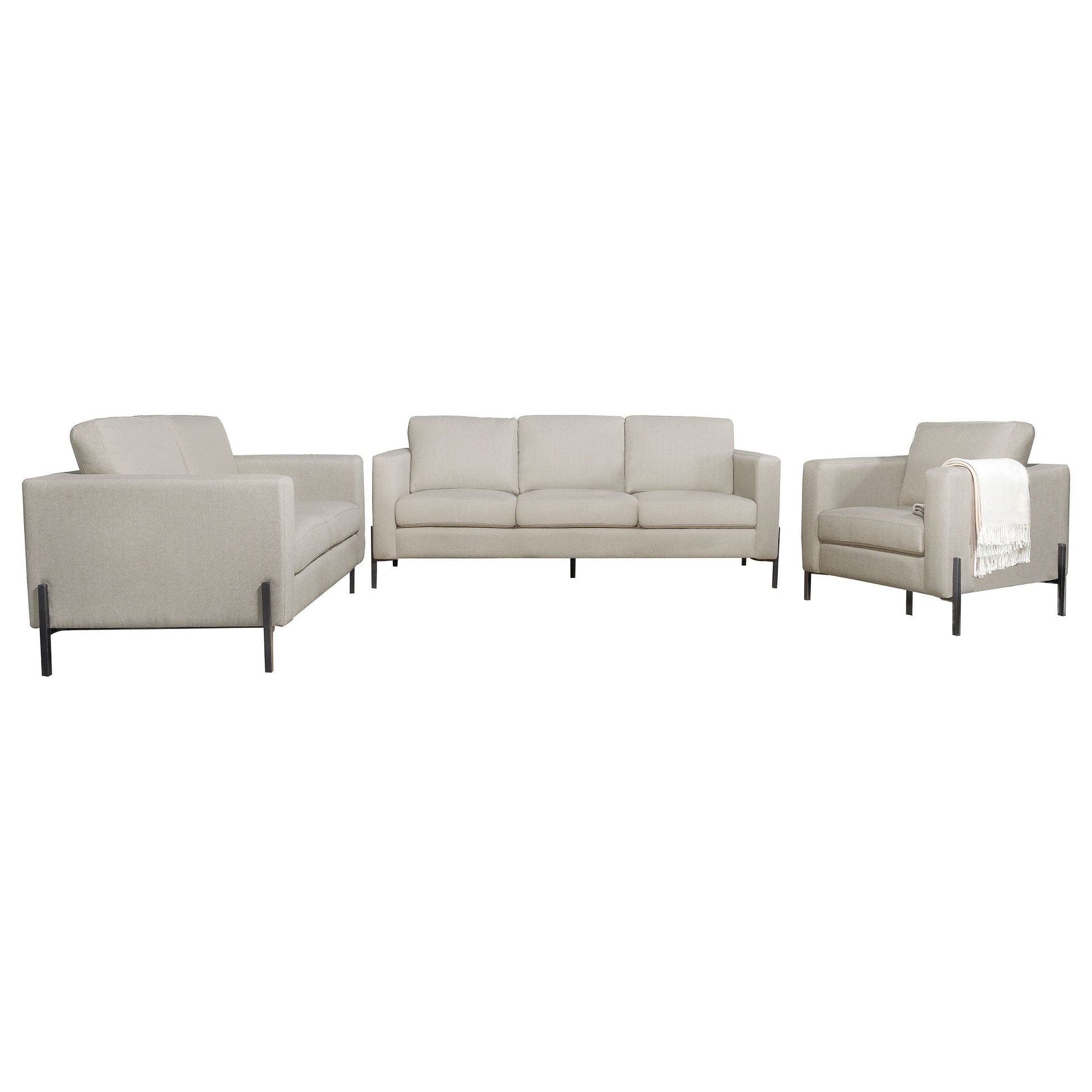 Presentamos nuestro moderno juego de sofás, meticulosamente diseñado, la personificación del lujo y la comodidad. Con líneas limpias y una confección impecable, su discreta tela texturizada de espiga irradia sofisticación. Los asientos, fabricados con muelles embolsados, prometen una comodidad inigualable, haciendo que cada momento en el sofá sea memorable. Complementado con la elegante base elevada de patas metálicas en un elegante acabado negro, este juego de sofás destaca no solo por su belleza, sino también por su durabilidad. Fabricado con precisión, es un conjunto tan acogedor como elegante, que garantiza que su sala de estar irradia un encanto contemporáneo. Sumérjase en una comodidad y un estilo inigualables.