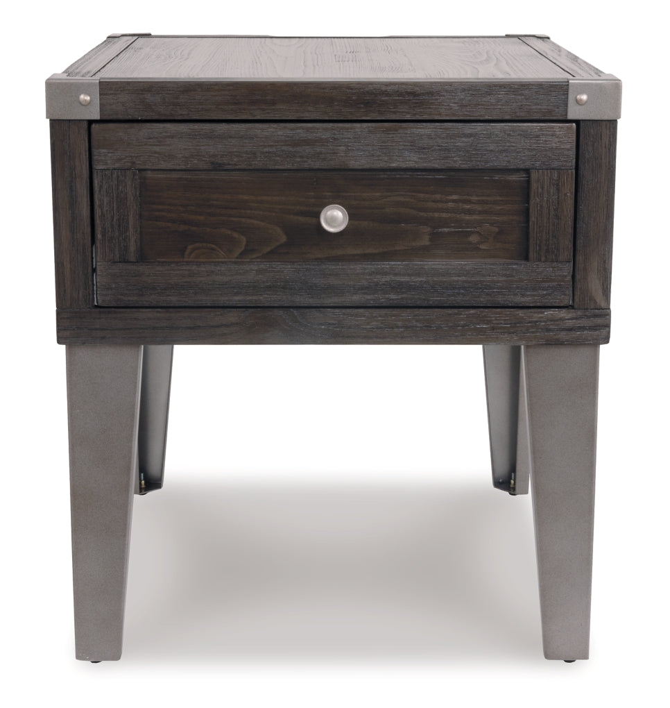 Take a stance for rustic-industrial style with this mixed material end table. Weather-washed pine wood and veneers are contrasted with canted metal legs and corner bracket accents for a uniquely chic merger of earthy beauty and contemporary flair. Power plug-ins and USB charging ports mounted on the back add practical function to great form.