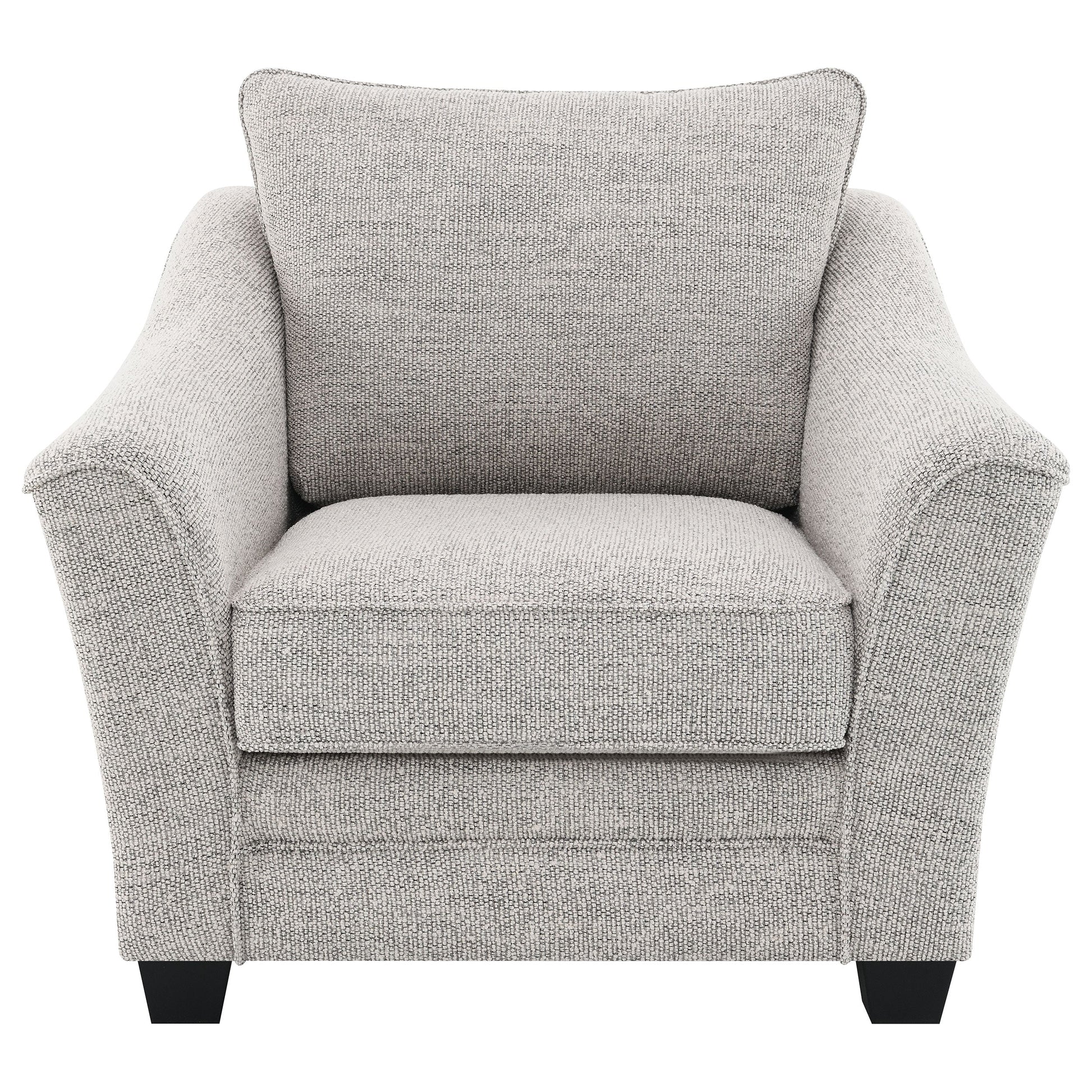 Acomódese en este sillón moderno y elegante, perfecto para la sala de estar. El sillón luce una tela de bouclé texturizada, que ofrece una textura impecable y un atractivo moderno, ideal para camuflarse. Sus brazos inclinados, que evocan un perfil elegante, y los cojines del asiento con forma de caja le dan un aspecto acogedor, realzado por los altos cojines del respaldo, todos con ribete de ribete. El sillón reposa sobre patas altas y cuadradas, que le proporcionan una base robusta y un acabado oscuro que completa su estilo. Estas patas incluyen deslizadores de plástico que protegen el suelo, garantizando que el sillón no solo sea elegante sino también práctico.