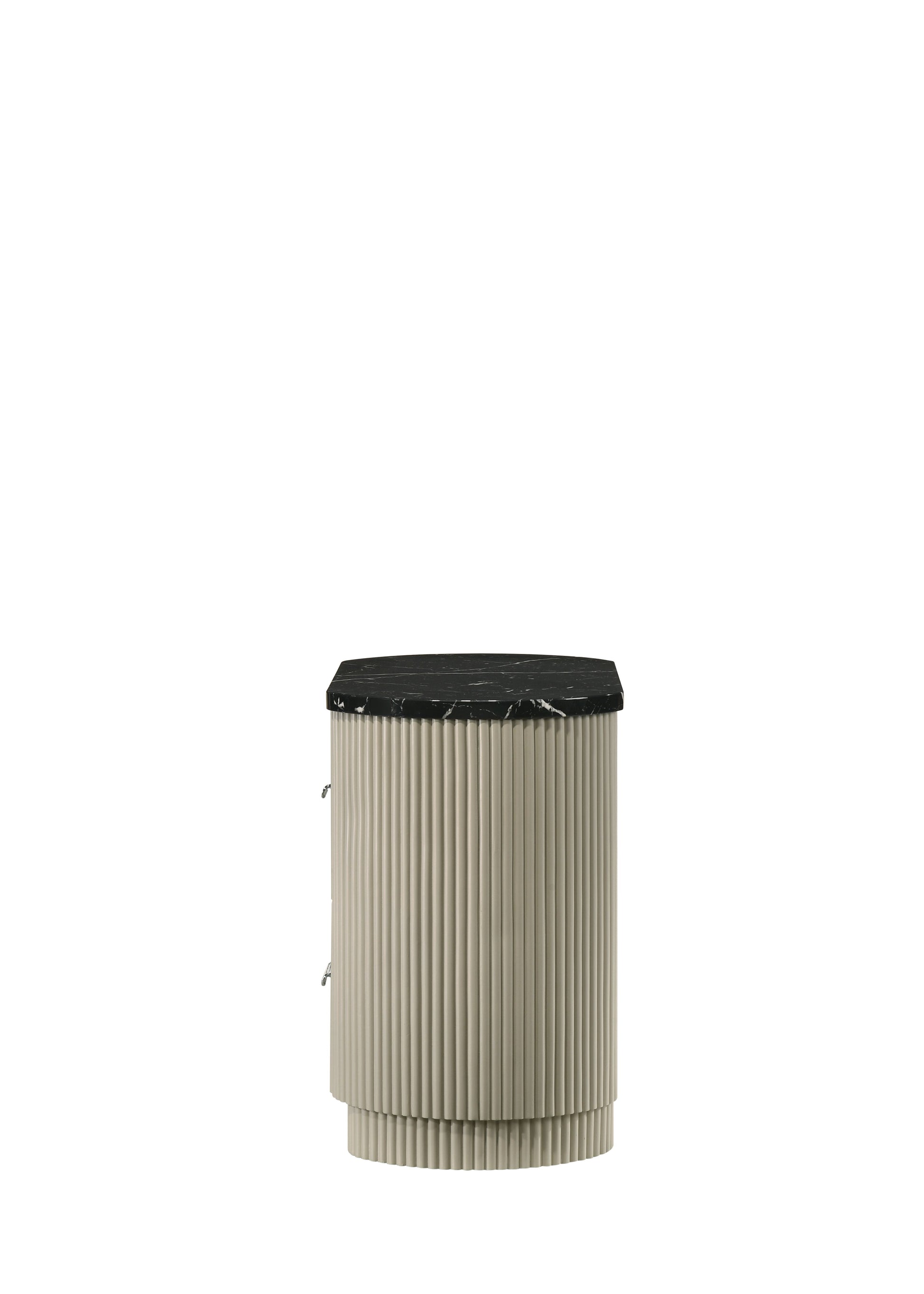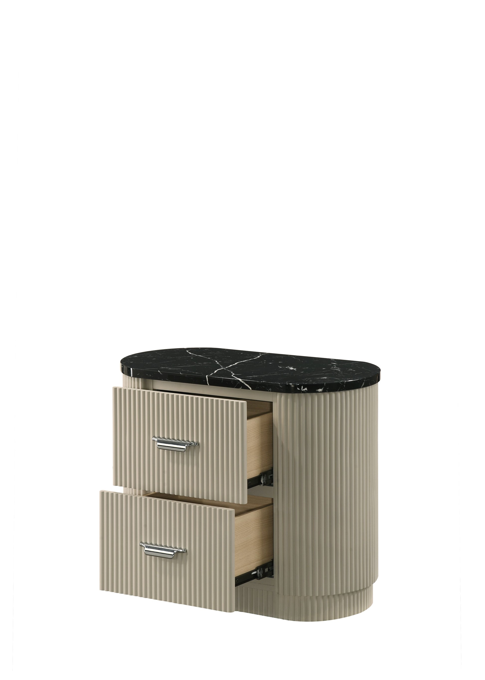 Refined elegance meets practical design in this Travonte nightstand. Its striking black marble-look top contrasts beautifully with textured vertical panels, while dual drawers with sleek silver handles keep essentials within reach. Rounded edges and a raised base add a soft, modern touch, making this piece both functional and stylish.