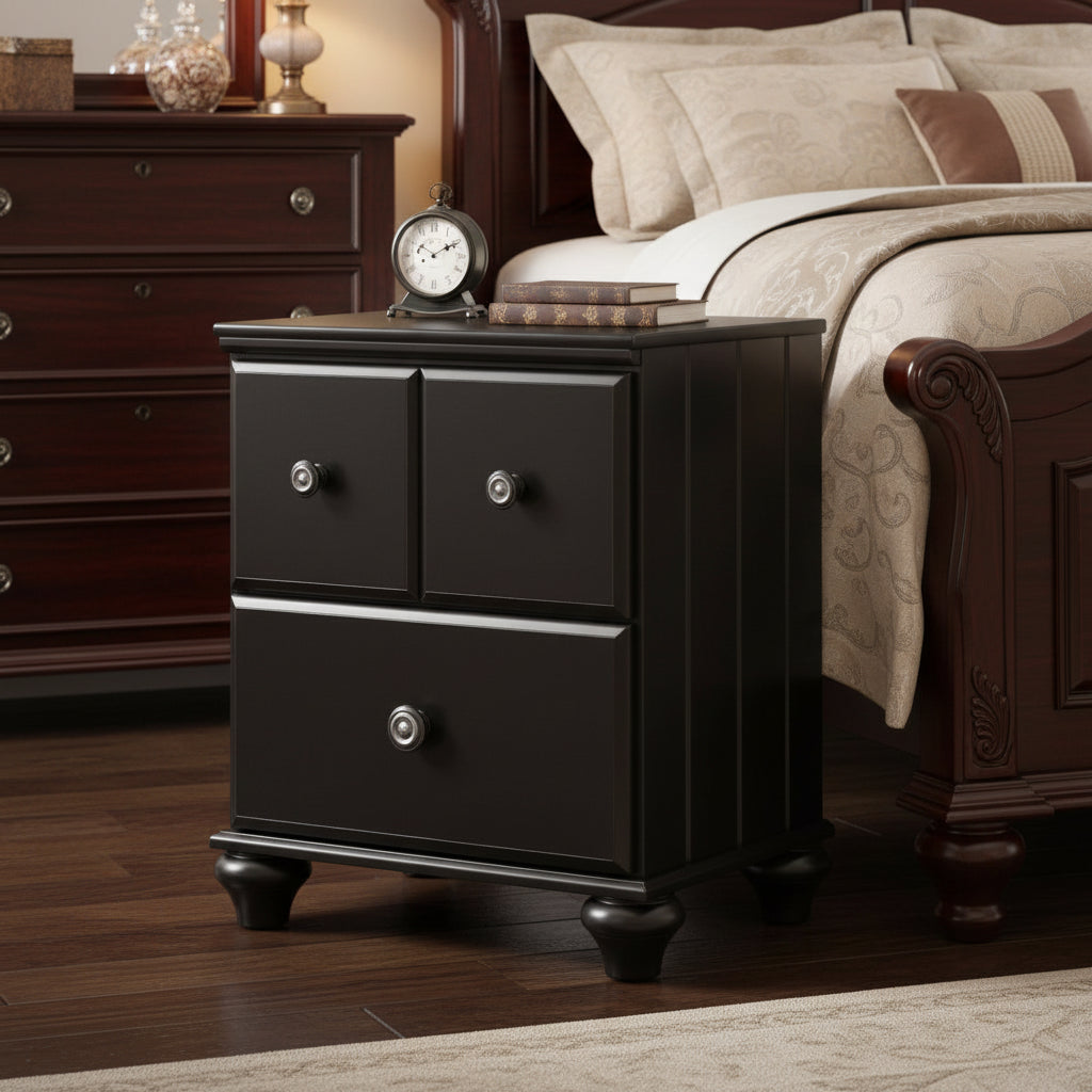 • 3 cajones con interior completamente terminado (cajón superior forrado con fieltro), construcción de cola de milano y guías laterales resistentes con cojinetes de bolas