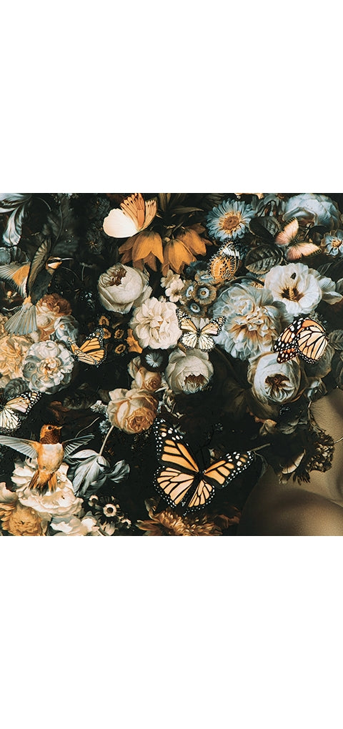 This wall art is a captivating piece that celebrates nature's profuse beauty. A stunning portrait of a woman with a flowing headdress teeming with flowers and butterflies, it adds a touch of elegance and enchantment to your home. The rich color palette and intricate details create a visually stunning display, while the overall composition exudes a sense of tranquility.