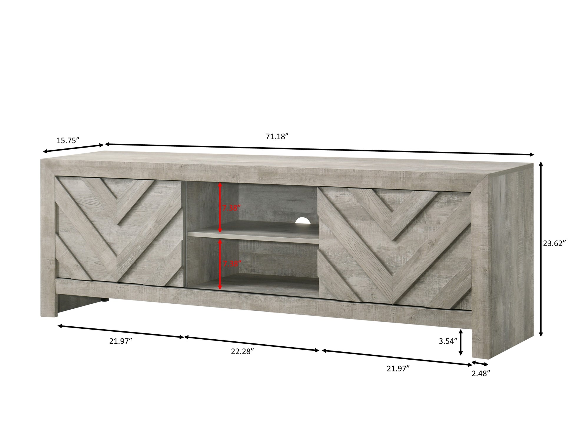 Discover the epitome of rustic elegance with this captivating entertainment console, designed to anchor your living space with its distinct and artful presence. The washed wood finish offers a serene, natural aesthetic that brings the essence of a tranquil retreat into your home. The geometric chevron patterning on the cabinet doors adds a touch of modern sophistication, making it a versatile piece that complements both contemporary and traditional interiors. Function meets form as this console provides ample space for multimedia devices, gaming consoles, and other essentials, all while maintaining a clutter-free environment.. Sliding doors Open shelving Cable management