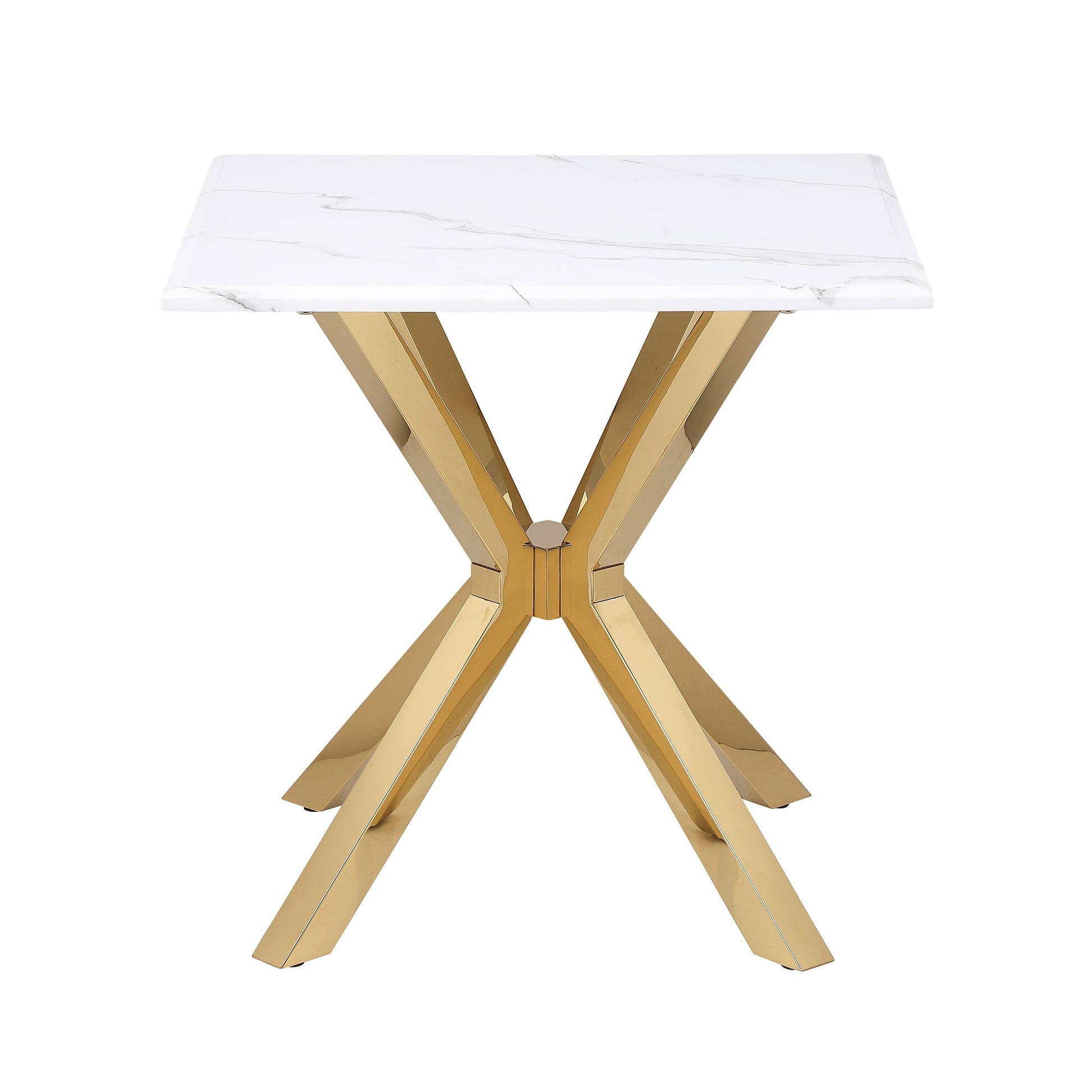 Dale un toque de elegancia a tu sala de estar con esta moderna mesa auxiliar cuadrada, con una superficie de imitación mármol blanco y vetas realistas que le dan un toque sofisticado. Su robusta base inoxidable está fabricada en acero inoxidable con un diseño en forma de estrella y rematada con un radiante revestimiento dorado mediante Deposición de Vapor de Partículas (PVD). Perfecta para decoración, lámparas o artículos esenciales, esta elegante mesa combina una estética lujosa con una funcionalidad práctica, convirtiéndola en un complemento destacado para cualquier interior moderno.