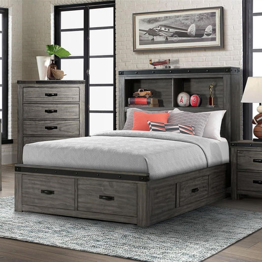 La colección de dormitorio Wade de Elements Furniture aportará comodidad y un toque moderno a cualquier dormitorio. Su diseño contemporáneo se complementa con la fusión de metal y madera, líneas limpias y un hermoso acabado gris. Su característica más destacada son las tiras de metal cepillado que contrastan con la calidez del acabado gris de la madera. Su artesanía y diseño la convierten en una fantástica adición a cualquier hogar.