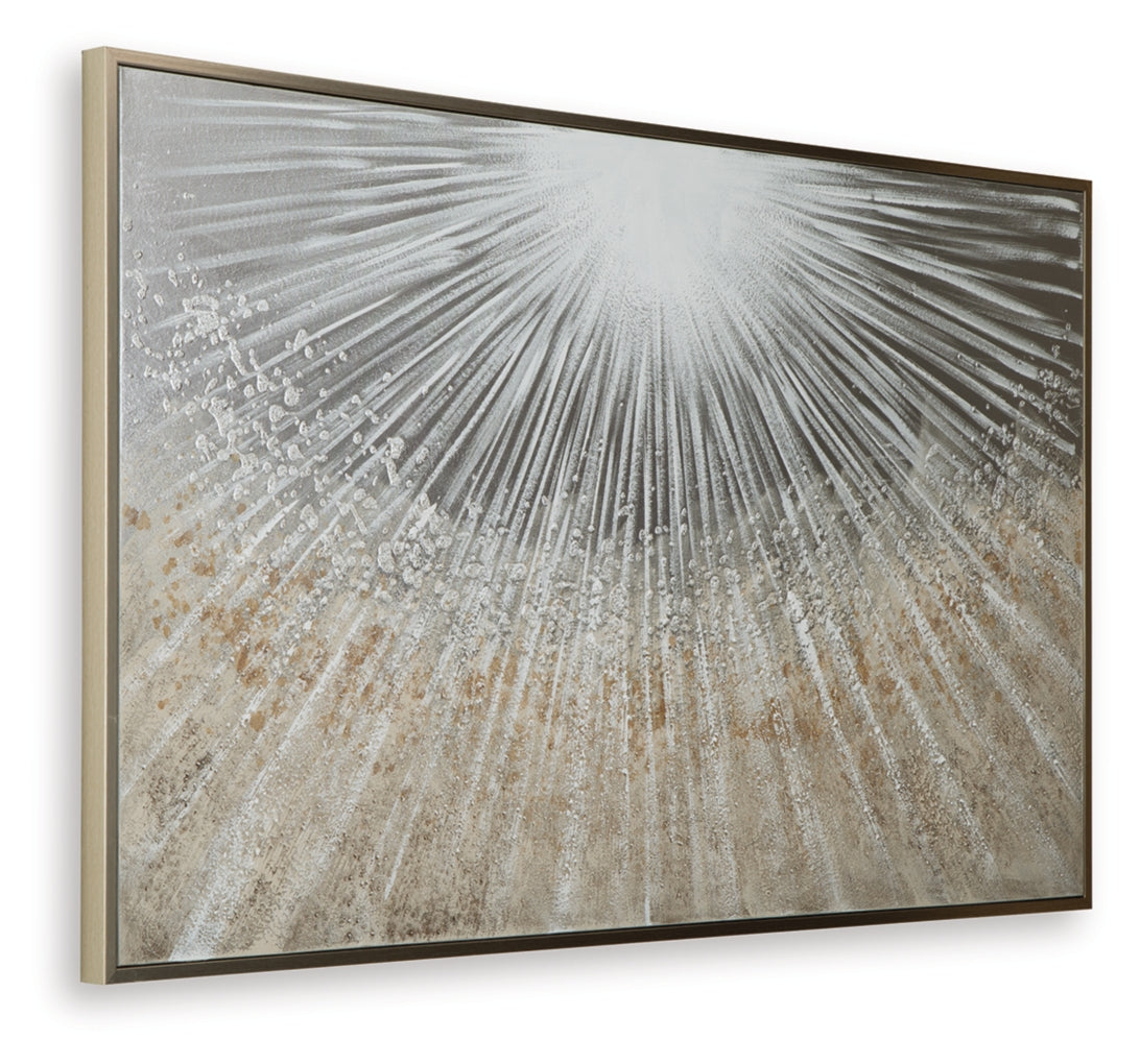 Brighten up your decor with this wall art. Its abstract design recalls the beauty of sunbeams peeking through the clouds, with gleaming metallic foil embellishments for added flair. A coordinating champagne-colored frame beautifully completes the piece.