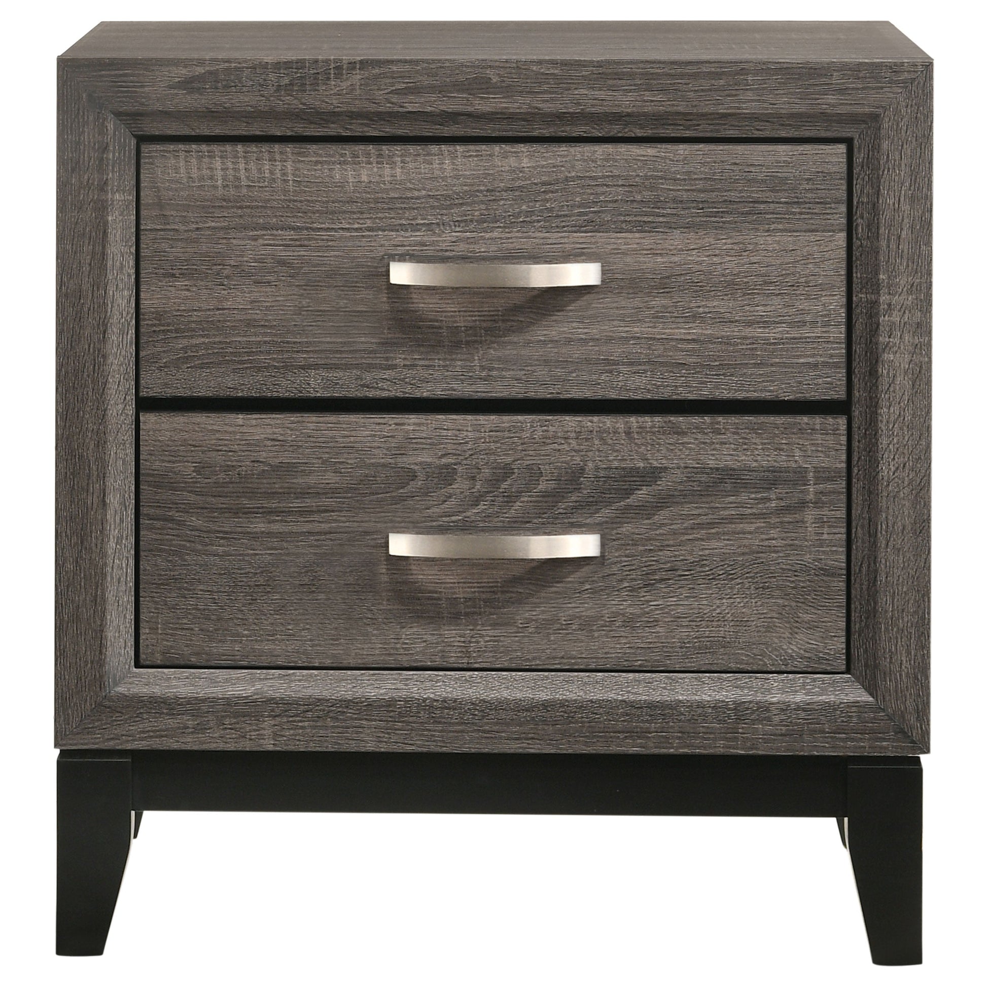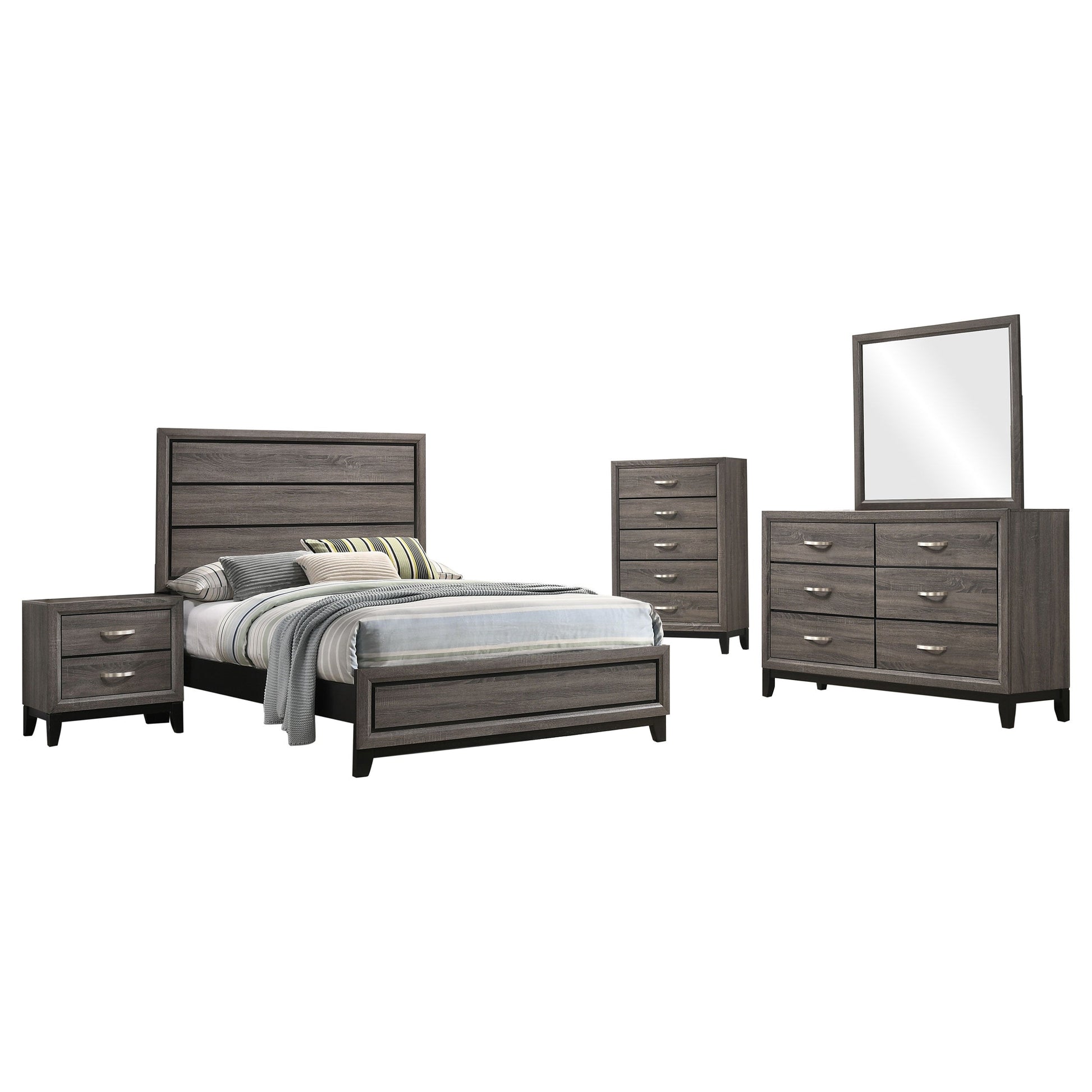 Renueva tu espacio de descanso con este juego de dormitorio de transición en dos tonos. La cama cuenta con un cabecero de un solo panel con ranuras que le dan textura. El pie de cama bajo complementa el cabecero con un diseño similar. Para guardar cosas, disfruta de la mesita de noche de dos cajones y una cómoda de seis cajones con espejo a juego. Una cómoda opcional de cinco cajones completa este juego de dormitorio de transición.