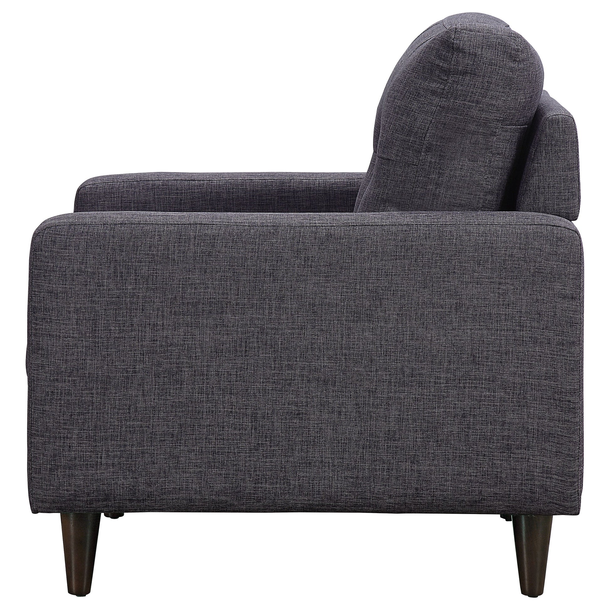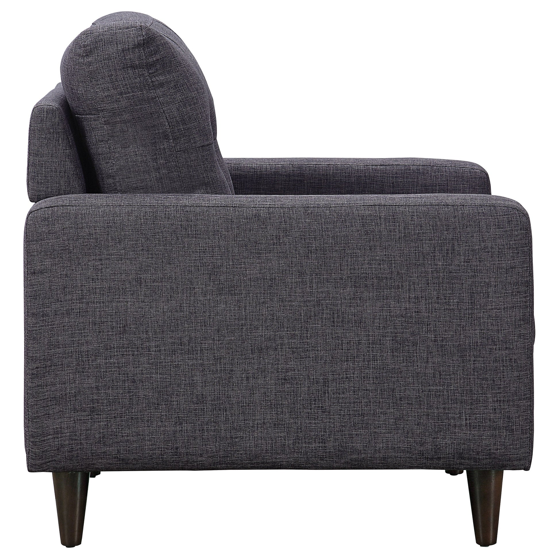 Este sillón es un complemento atractivo para cualquier sala de estar o sala de juegos. Presenta patas redondas y cónicas y reposabrazos de líneas limpias y rectas. Los suntuosos cojines del asiento garantizan tardes y noches de cómoda relajación. El respaldo capitoné añade un toque de estilo atemporal. Está tapizado en tela gris oscuro, ideal para cualquier decoración.