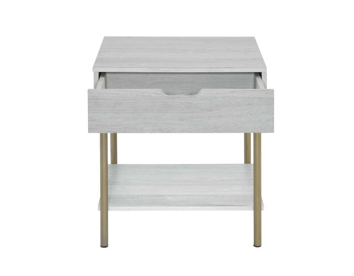 Elegancia moderna de mediados de siglo en una mesa para sala de estar o dormitorio. La mesa auxiliar Whitman tiene el aspecto y la textura de una pieza antigua blanca envejecida, complementada con patas tubulares color champán. Un estante inferior añade espacio de exhibición o almacenamiento a cualquier habitación, y el cajón extraíble es un práctico lugar para controles remotos o dispositivos electrónicos. La ranura del cajón le da un aspecto práctico y limpio, ideal como mesa auxiliar o mesita de noche.