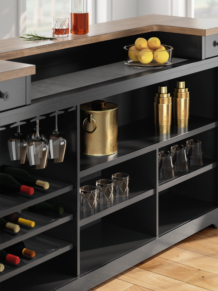 This bar dresses up your favorite farmhouse motifs with modern flair. Its handsome good looks are accentuated with a two-tone finish and a casual butcher block veneer top. The sturdy silhouette adds a hearty element, whether your style is vintage, country or eclectic. Step behind the bar and youÕll discover tons of open storage and two drawers perfect for barware accessories. A stemware rack and reversible wine bottle shelves go with the flow.
