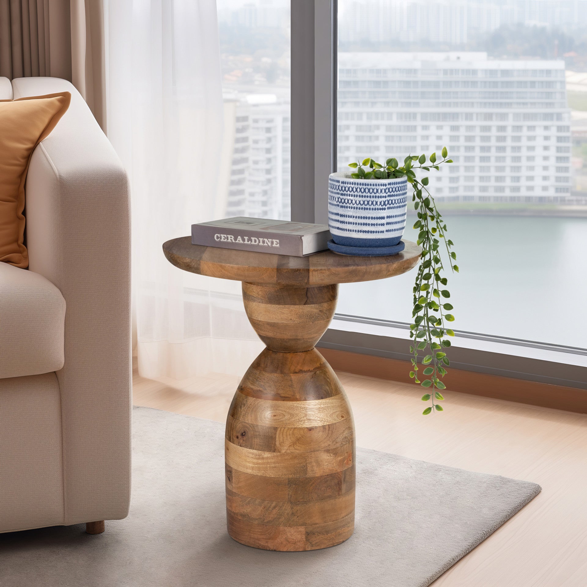 - Esta mesa auxiliar con pedestal de madera de mango natural es el complemento perfecto para cualquier habitación, gracias a su diseño sencillo y orgánico. Su acabado cálido y natural complementa cualquier decoración.