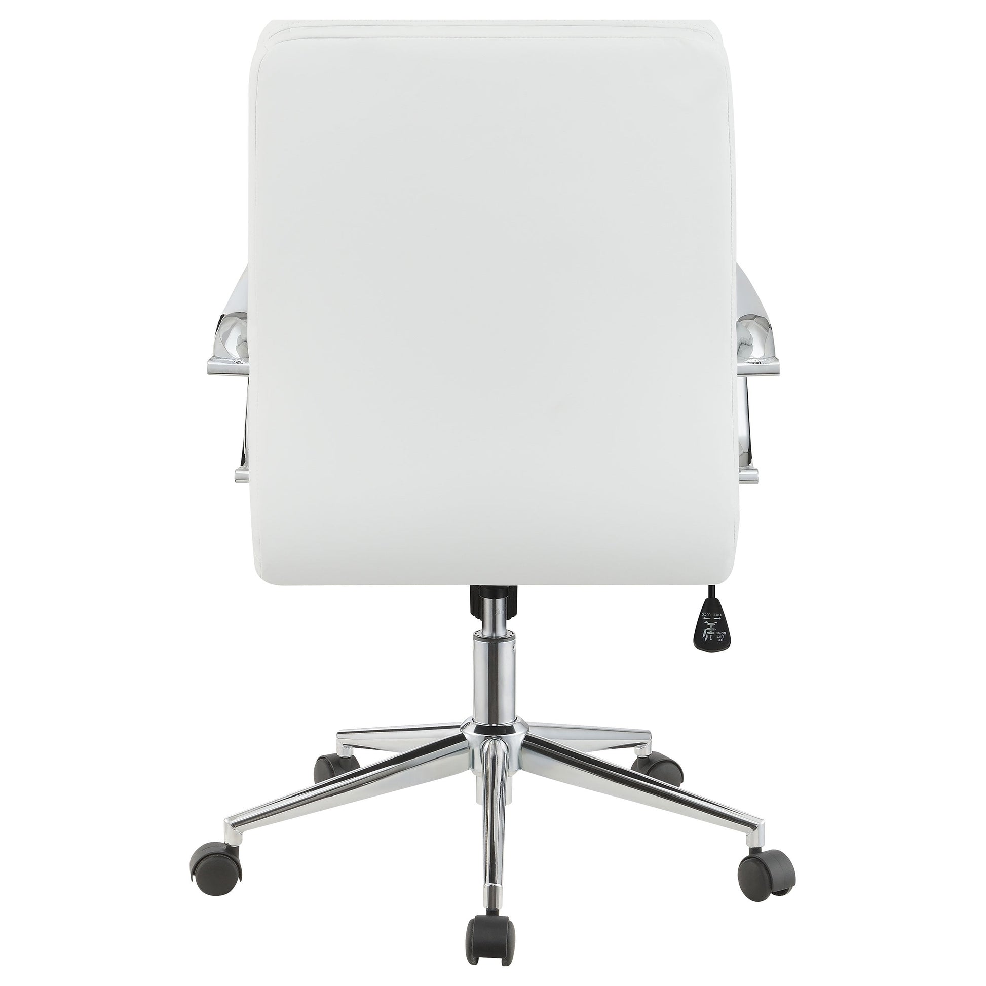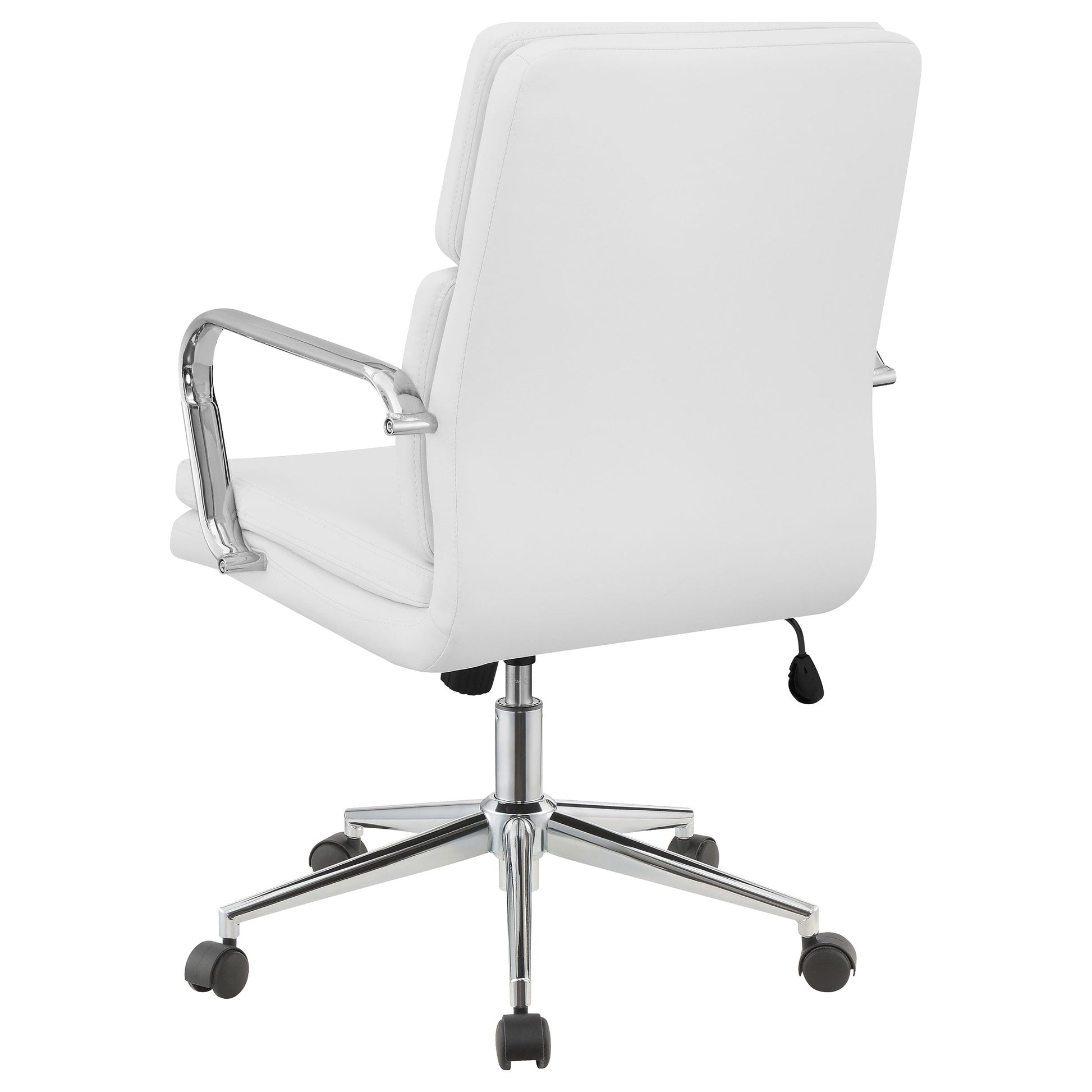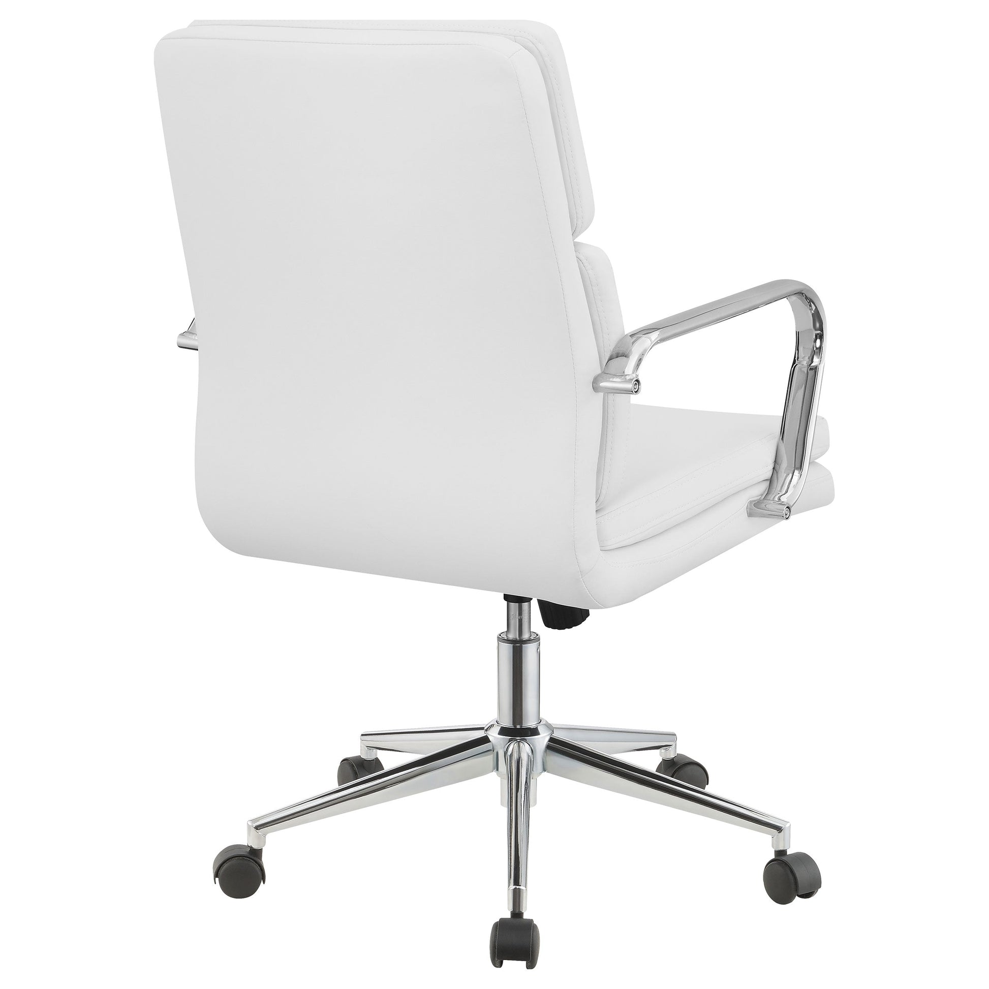 Trabaje con comodidad y estilo modernos con esta silla de oficina. El elegante diseño de la estructura y los brazos de metal luce un acabado cromado brillante. Esta silla acolchada presenta un respaldo medio contorneado para una comodidad excepcional en una silueta discreta. Su nueva silla de oficina favorita es ajustable en altura y cuenta con ruedas para facilitar su manejo en espacios de oficina concurridos. La tapicería de polipiel flexible está disponible en los colores que elija para complementar la decoración de su oficina.