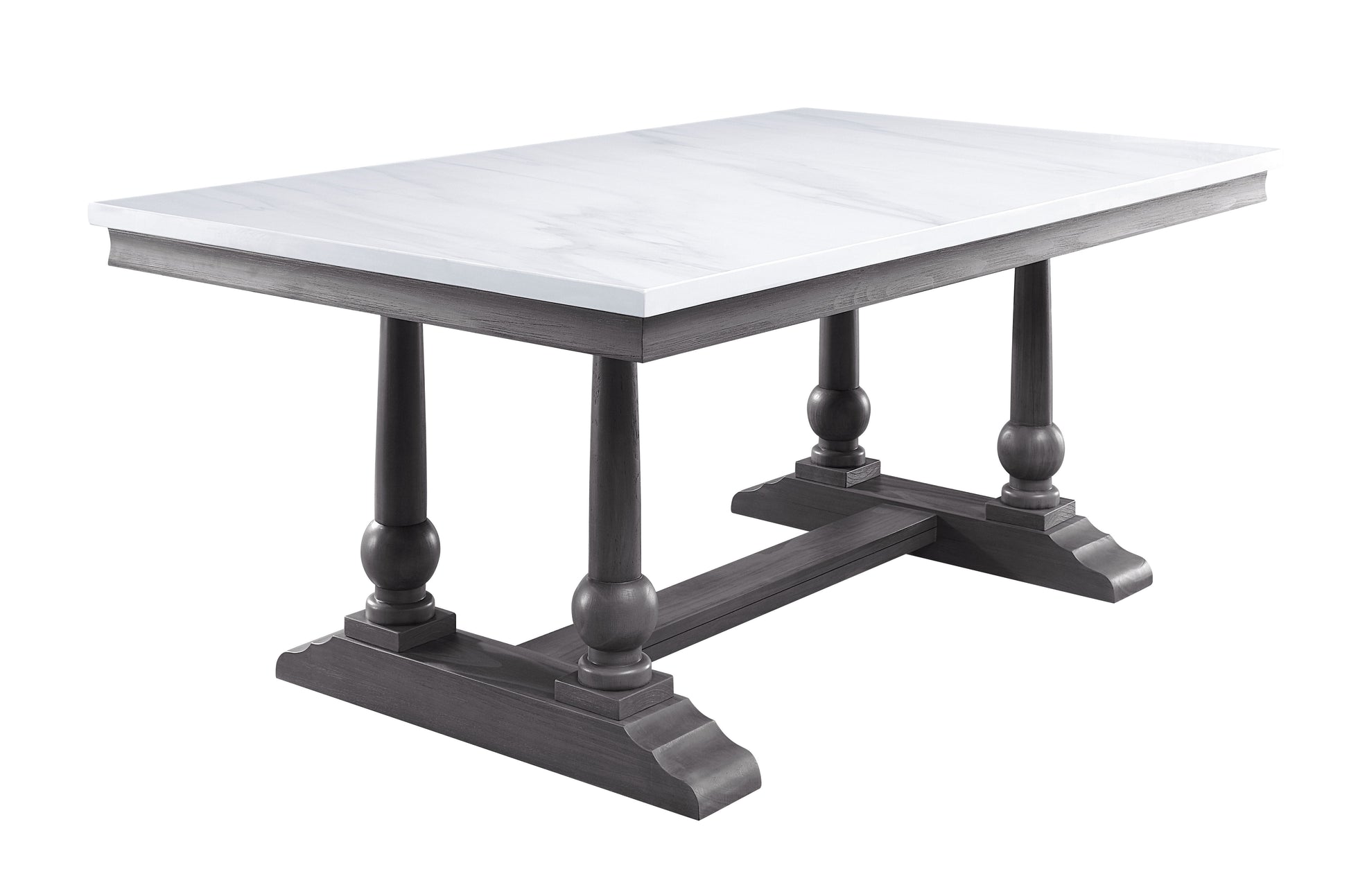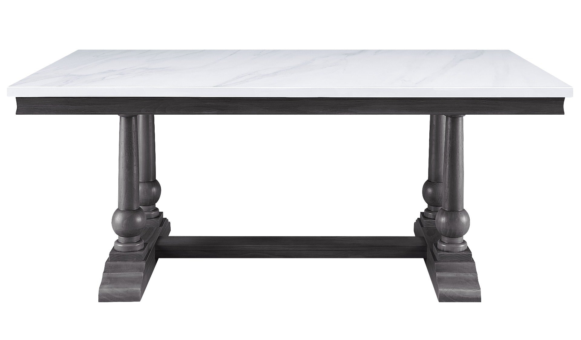 Elegantemente elaborada en madera con un acabado de roble gris terroso y discreto, la mesa de comedor cuenta con una robusta base de caballete inspirada en la estética de la arquitectura clásica. El tablero de mármol artificial blanco sobre la estructura de madera crea un impresionante diseño bicolor que le otorga una belleza atemporal. La mesa de comedor rectangular tiene capacidad para seis personas cómodamente y permite que sus invitados disfruten de sus comidas sin sentirse apretados.