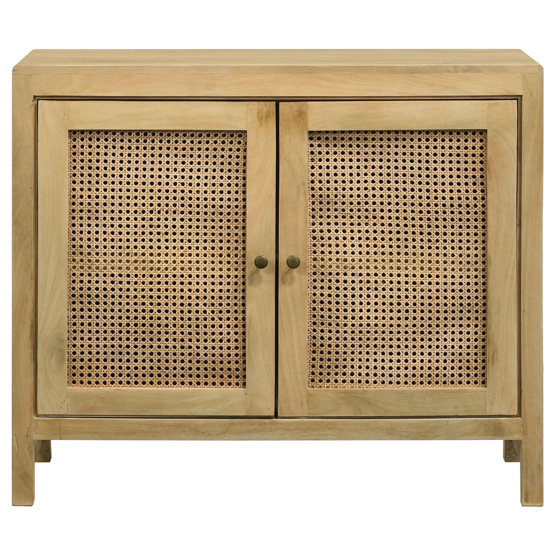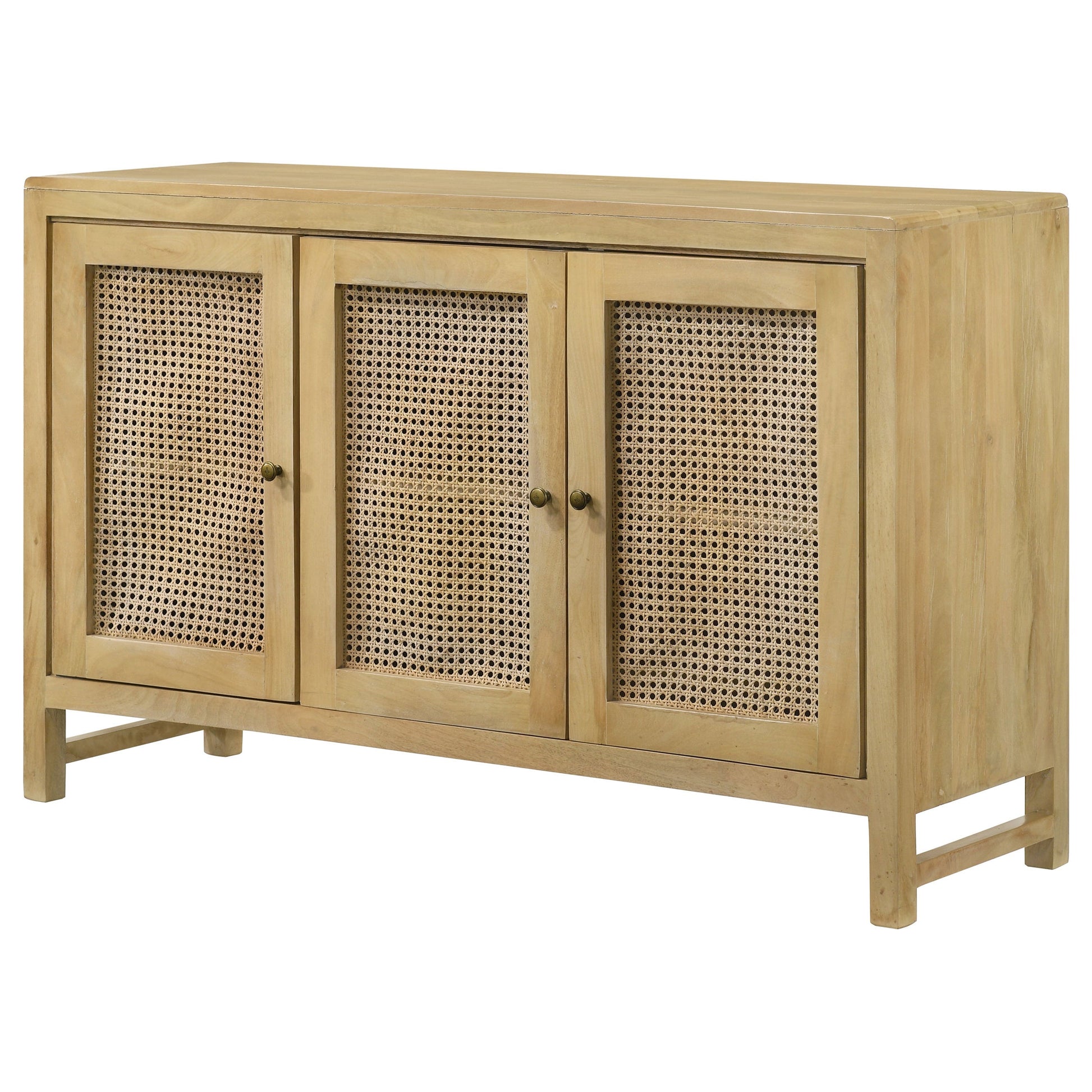 Infunda su espacio con la belleza orgánica de este mueble auxiliar de inspiración global, elaborado con madera de mango ecológica y un cálido acabado natural. Las tres puertas cuentan con paneles de caña tejida, que le dan un toque retro y permiten una ventilación sutil. Los pomos con acabado en latón antiguo ofrecen un contraste refinado, realzando el encanto atemporal del mueble. El espacioso interior con estantes ofrece amplio espacio de almacenamiento para artículos esenciales de comedor, la organización de la entrada o la decoración de la sala de estar. Con líneas limpias, bordes redondeados y un tono de madera clara, este mueble combina la simplicidad moderna con un encanto natural.