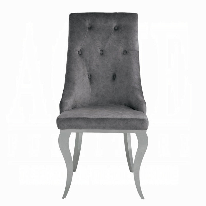 Each chair features plush, foam-cushioned seating that provides exceptional comfort for everyday dining or entertaining guests. The tufted backrests add a touch of sophistication, while the convenient metal pull rings on the back make the chairs easy to move and handle. Upholstered in a soft, neutral gray fabric, the chairs complement the sleek table design and integrate effortlessly with any color palette or interior theme.