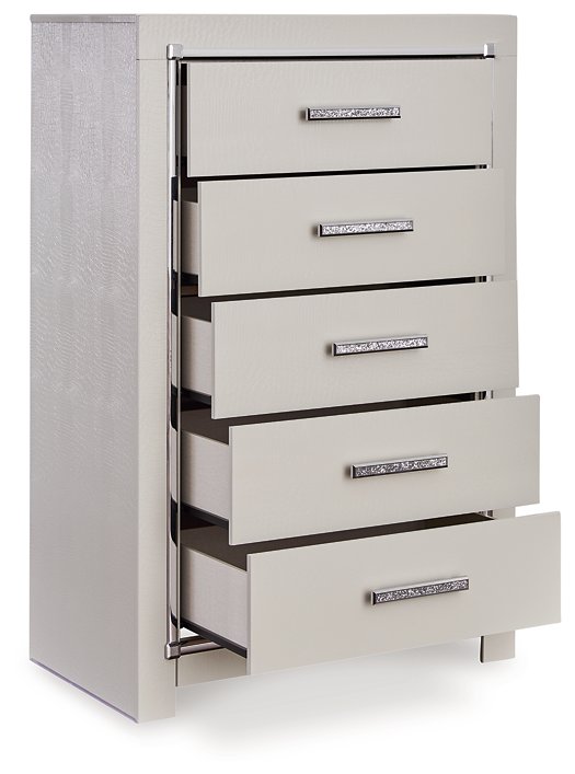 Lujo brillante y audaz. Esta cómoda deslumbra con su atención al detalle. Tu pasión por el estilo glamuroso se refleja en su imitación de cocodrilo con acabado metálico, que combina a la perfección con detalles cromados facetados. Completa con cajones de almacenamiento de deslizamiento suave, te inspira a vivir con lujo cada día, ya sea que te vistas elegante para salir o informal para quedarte en casa.