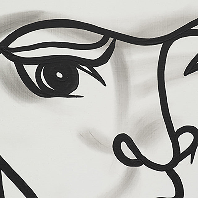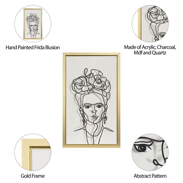 Make a bold artistic statement with this striking hand-painted portrait inspired by the iconic Frida Kahlo. Rendered in a modern black-and-white line-art style, the piece showcases Frida’s unmistakable features and signature floral hair motif, creating an expressive and contemporary visual impact. Set within a slim gold-tone frame, this oversized artwork instantly elevates any space with its blend of elegance and character.