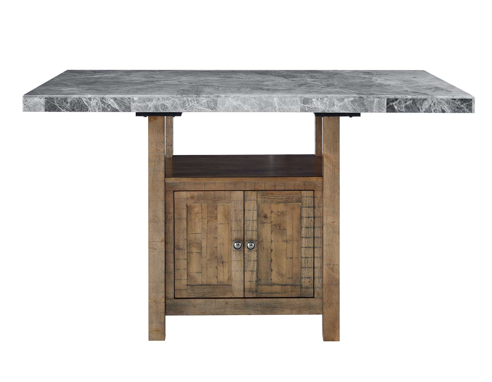 Refined rustic styling brings in an elegantly casual Storage Counter Dining Table. A beautiful gray marble top pairs beautifully with a dusty honey finish in a style that is good for both everyday and special event dining. The Counter Table offers valuable storage in the base for placemats, silverware or other items. The 60 inch table accommodates six comfortably using the available Counter Chairs and/or Counter Bench.
