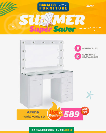 Boasting a Hollywood regency flair, this vanity offers a bold, clean-lined aesthetic for a contemporary home as it shows off a white finish throughout that opens itself up to your existing color palette. Keep all of your cosmetics and beauty products organized within the seven spacious drawers, displaying special items in the top three. Above the top row of drawers is a clear tempered glass top that showcases everything beneath. Each drawer is also adorned with a glimmering crystal-like acrylic knob. Lastly, the oversized vanity mirror offers all the glow you need, complete with eleven globe-style bulbs that lend a vintage vibe.