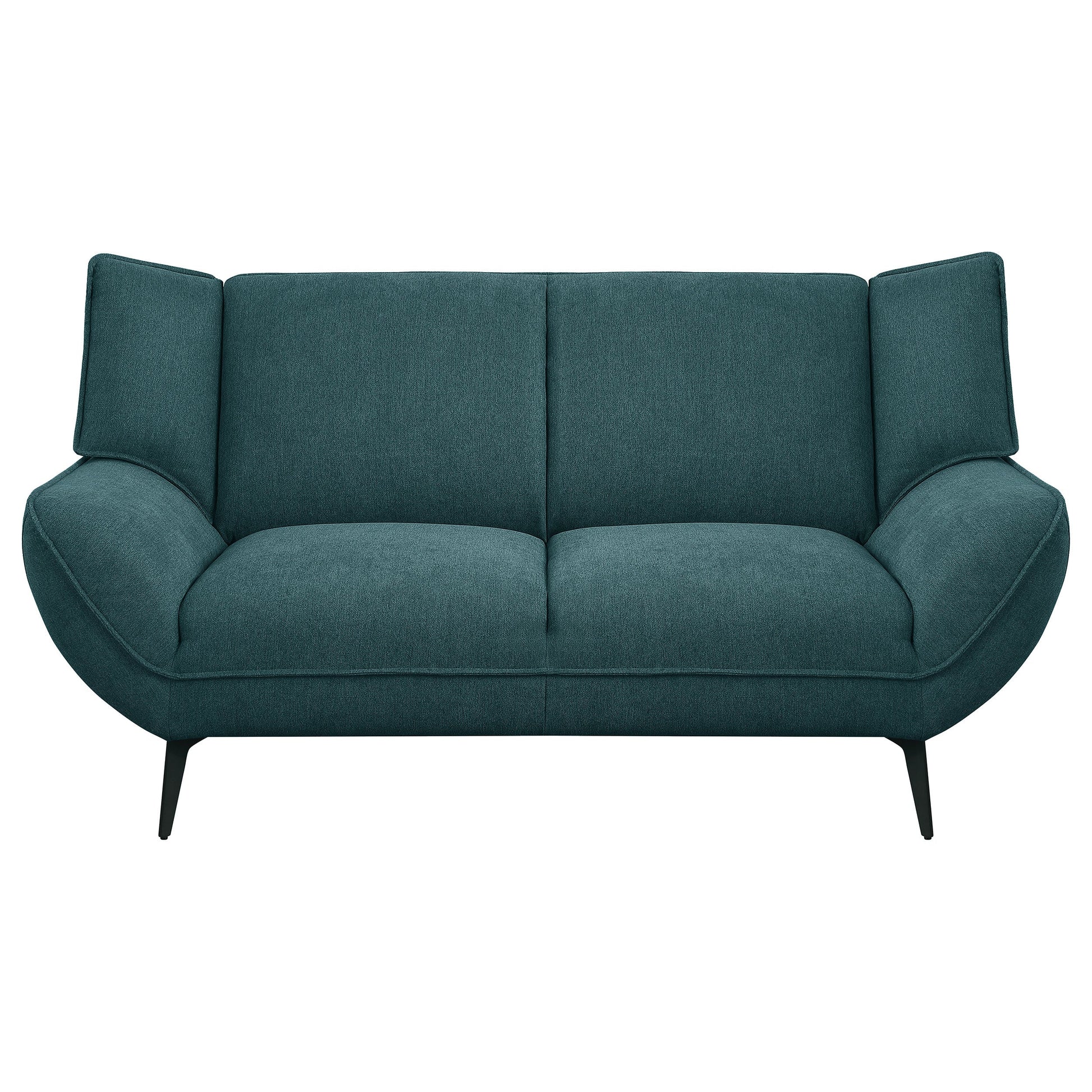 Bring the best of mid-century modern style to your casual space with this sofa set that inspires. This comfy and stylish teal blue set is a great choice for outfitting a living room or family room. Gorgeous fabric upholstery opens up possibilities for a lush palette choice. Flared arms and wing backs attach to non-removable seat and back cushions. Tapered black metal legs coordinate with the beautiful teal blue upholstery.