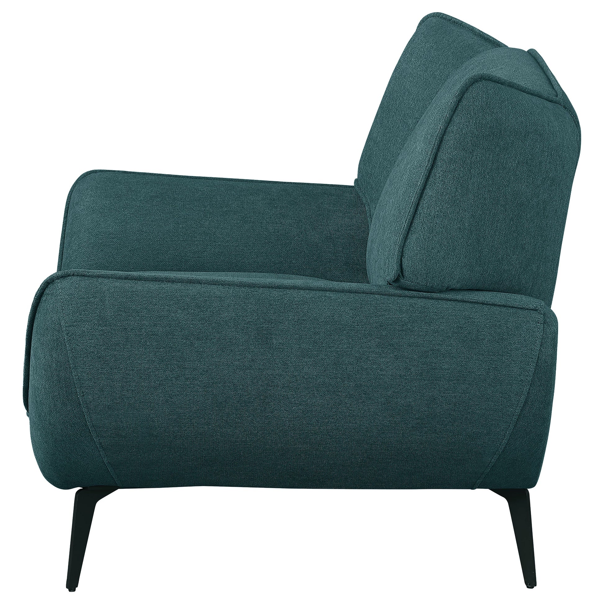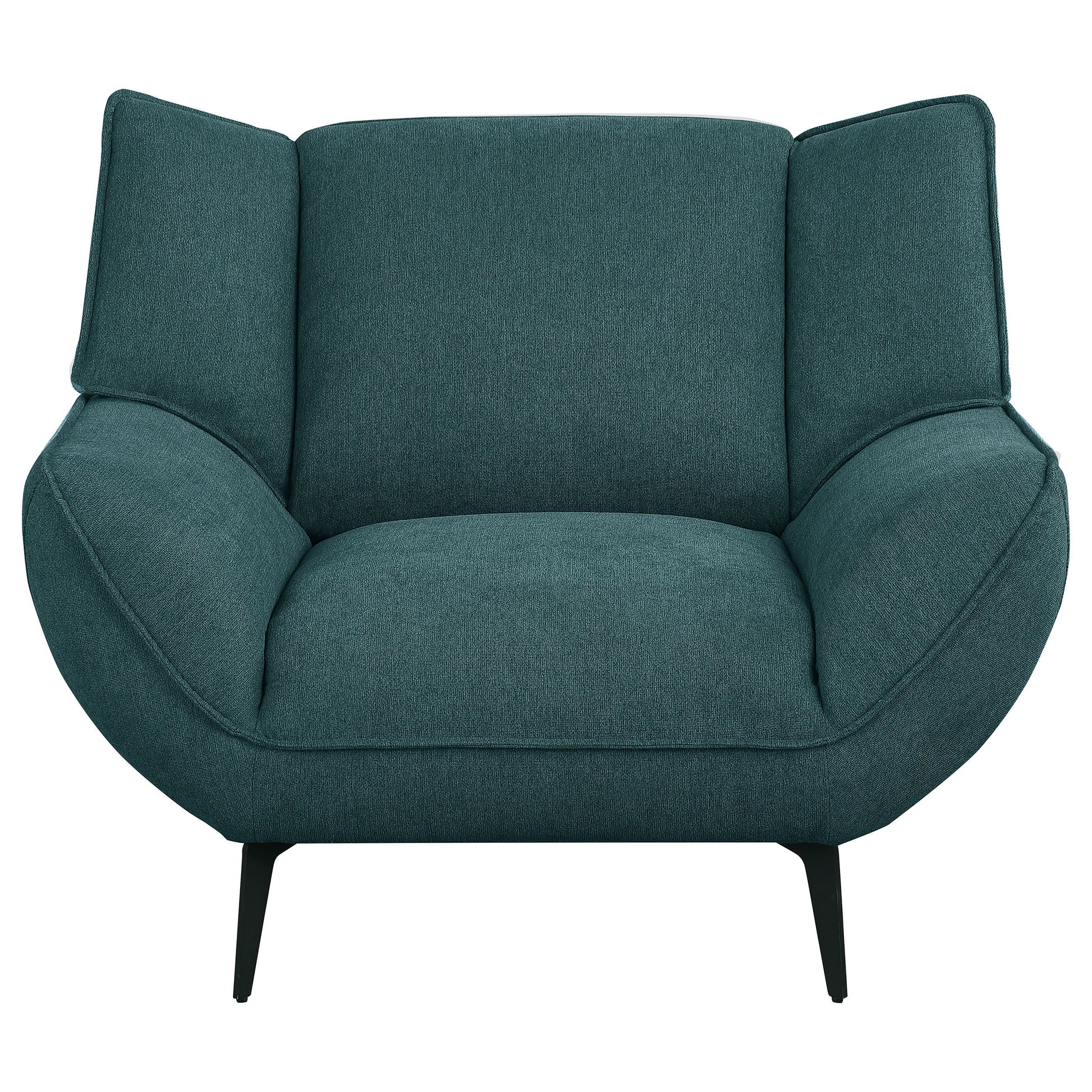 Extra width is extra comfort for lounging and reading in an easy, stylish chair with mid-century modern vibes. This comfy and stylish chair is a great choice for more compact spaces and apartments, or as a partner to a seating ensemble. Gorgeous teal fabric upholstery opens up possibilities for a lush palette choice. Flared arms and wing backs attach to a non-removable seat and back cushion. Tapered black metal legs coordinate with the beautiful teal upholstery.