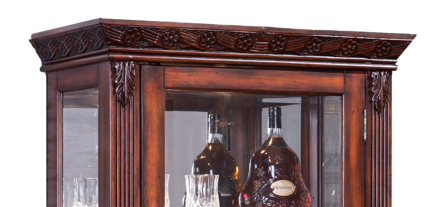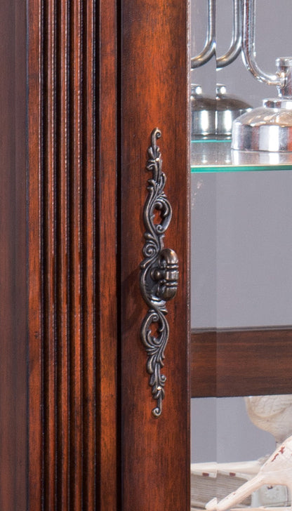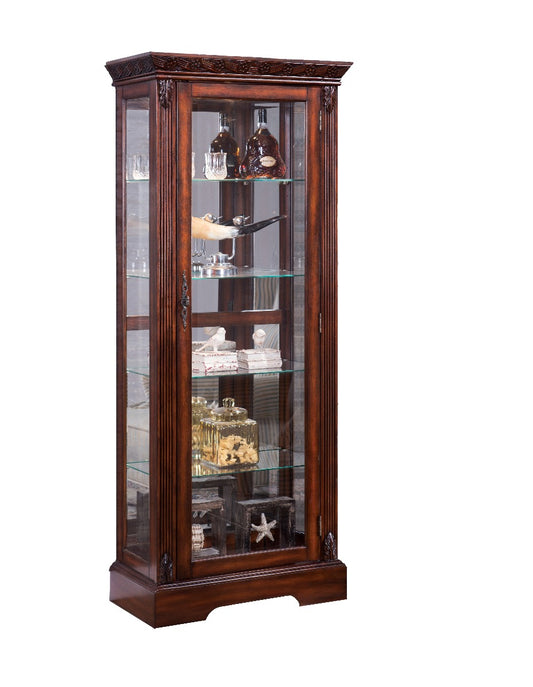 The Addy Curio Cabinet will add beauty and design to any room. This detailed and stylish cabinet has tempered glass doors and shelves and is uniquely designed to be a welcome addition to your decorative collection. This sophisticated cabinet in a warm cherry finish features vivid carving and molding detail which add a classical touch and distinguished look and feel. The open glass shelves are the perfect place to display glassware or other collectables in a fashionable way. This curio cabinet is a compliment to any home.