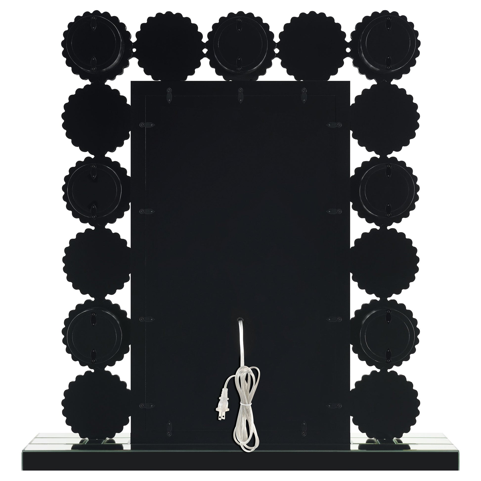 Rest this contemporary table mirror along a dresser or vanity surface for a playful, elegant aesthetic. Surrounded by seven LED bulbs that provide a soft, bright glow for perfecting your glow up, this table mirror offers a dramatic statement piece for bedrooms, bathrooms and more. The Hollywood inspired frame is bordered by individual round mirror tiles, each further framed in sparkling mirror trim. Bold lines and sophisticated mirror plates merge to offer a modern touch. A thick base also provides extra stability and support.