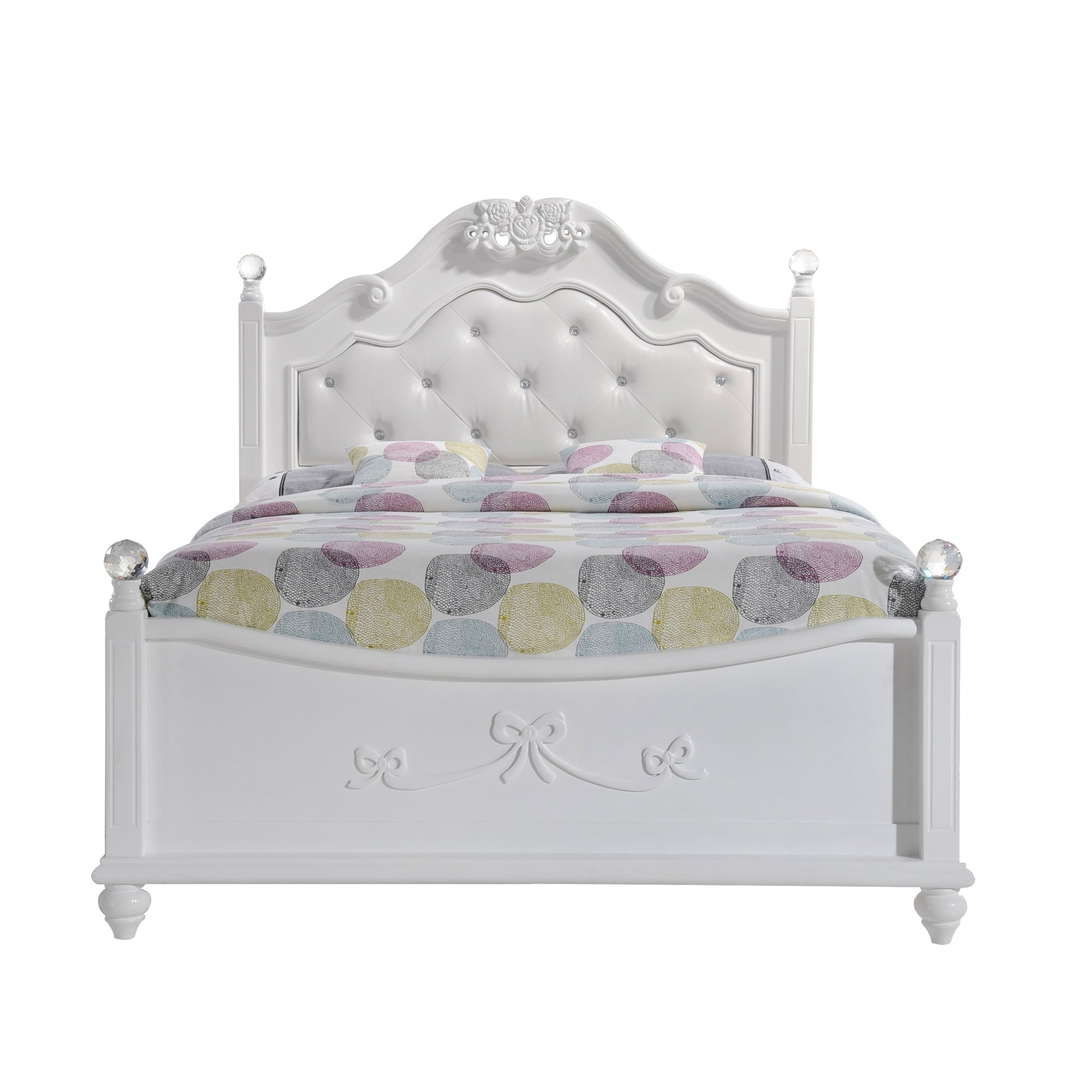 The Alana Full Platform Bed is what little girl dreams are made of. The twin bed offers a sense of wonder, featuring delicate bow moldings throughout, a button-tufted, white faux leather headboard, and sparkling crystal-ball posts.
