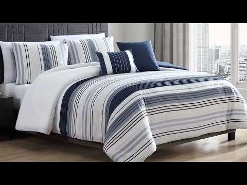 Elevate your bedroom with the Allen 5 pc Comforter Set, featuring a crisp white base accented by elegant blue stripes. This set combines classic style with cozy comfort, creating a fresh and inviting atmosphere for restful nights. Perfect for adding a touch of sophistication to any decor.