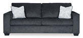 If style is the question, then this sofa is the answer. Sporting clean lines and sleek track arms, the decidedly contemporary profile is enhanced with plump cushioning and a chenille-feel upholstery that's so pleasing to the touch. Sure to play well with so many color schemes, this sofa in slate gray includes a pair of understated floral pattern pillows for fashionably fresh appeal.| Full Dimension | 85W x 38D x 37H |