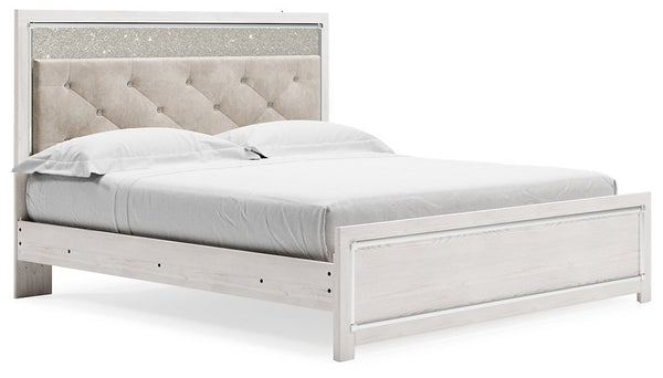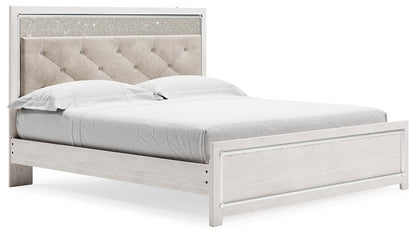 The epitome of fashion-forward design, this king upholstered panel bed is a beautiful blend of comfort and luxury. Shiny chrome-tone accents, a pearlized finish and button-tufted upholstery bring a glam touch to the richly rustic appearance. Remote-controlled LED lighting adds style and modern conveniences to your restful retreat.