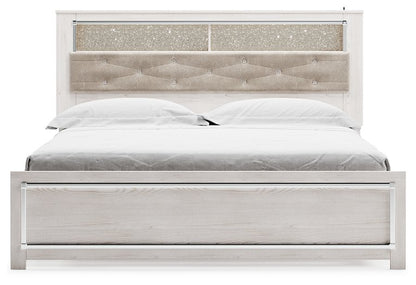 The epitome of fashion-forward design, this king upholstered bookcase bed is a beautiful blend of comfort and luxury. Shiny chrome-tone accents, a pearlized finish and button-tufted upholstery bring a glam touch to the richly rustic appearance. Remote-controlled LED lighting adds style and modern convenience to your restful retreat.