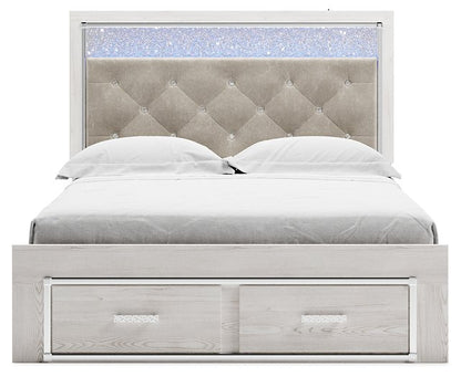 The epitome of fashion-forward design, this queen upholstered storage bed is a beautiful blend of comfort and luxury. Shiny chrome-tone accents, a pearlized finish and button-tufted upholstery bring a glam touch to the richly rustic appearance. Remote-controlled LED lighting adds style and modern convenience to your restful retreat.