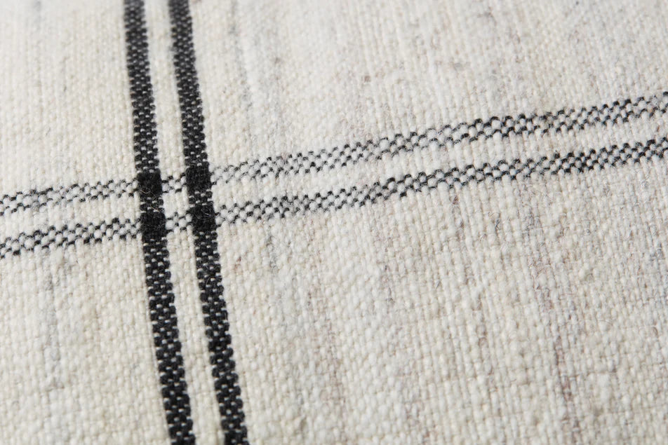 Sophisticated black and white pillow, meticulously hand-woven in India from polyester. It features a hidden flap closure and an antique bronze finish zipper adorned with the Loloi logo, adding a touch of refinement. The knife-edge treatment provides a crisp, clean finish, while the beige back color offers a subtle contrast and versatility. (13  x 35 inches)