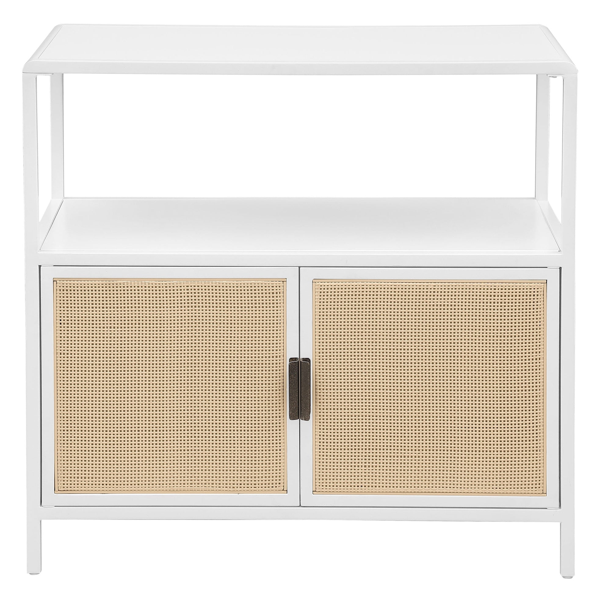 Elevate your storage solutions with this stylish two-door tall accent cabinet, expertly crafted from durable metal for long-lasting support. The sleek powder-coated finish adds a modern touch while providing excellent resistance to scratches and wear. The polyethylene (PE) rattan door fronts bring a hint of coastal charm, adding natural texture to your decor. With three tiers of open shelving, this cabinet offers ample space for displaying decor, books, or essentials, while the enclosed cabinet with a fixed shelf provides additional storage for items you want neatly tucked away. This versatile piece seamlessly combines function with style.