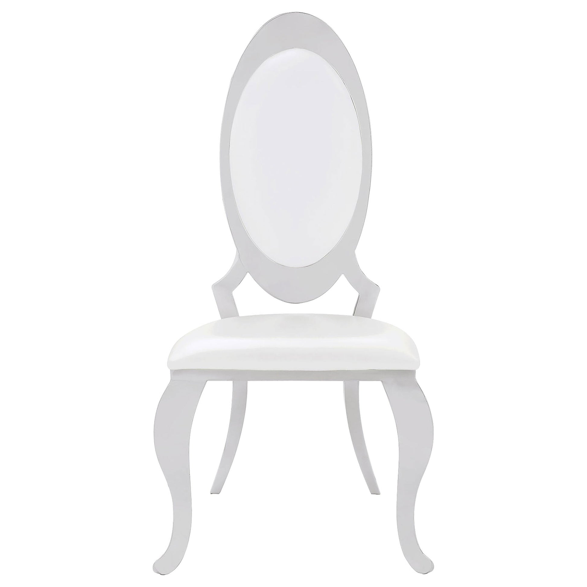 This dining chair blends classic form with modern materials for a bold statement. An oval backrest and gently flared silhouette evoke traditional influence, while the stainless steel frame and Queen Anne cabriole legs add a sculptural presence. Upholstered in smooth white faux leather, the cushioned seat and back provide comfort with easy care. The polished chrome finish completes the look with reflective shine and visual contrast.