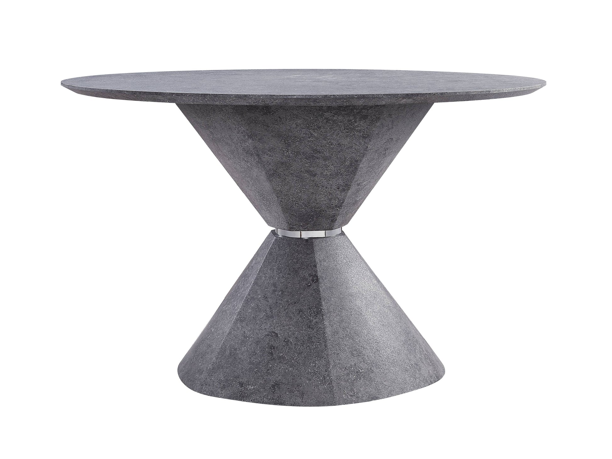 The Ansonia dining set features a pedestal dining table with a fixed round top and a trendy faux concrete finish. The matching side chairs are perched on sled metal bases with shiny chrome finish that contrasts beautifully with the gray PU upholstery on the padded seat and backs. In addition, decorative quilt-like stitching on the chair upholstery creates visual texture that looks as good as it feels.