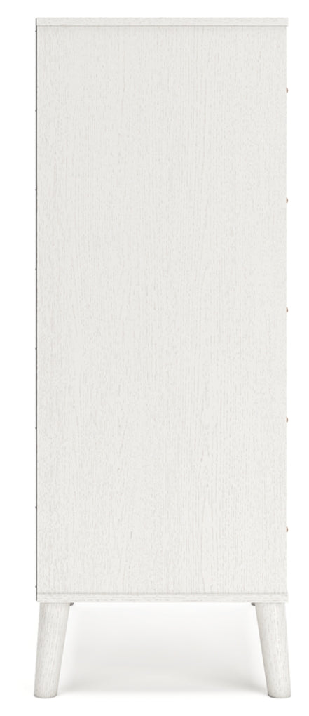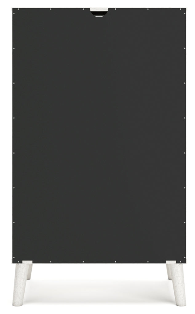 Dare to take minimalism to the max. This chest of drawers has an air of sleek simplicity thanks to its white painted finish with subtle replicated wood grain. Magnificently mod splay legs are a compelling complement to the streamlined design. And with two sets of faux leather drawer pulls that allow you to customize the chest to suit your space, there's no doubt about it: This contemporary piece is sure to become a classic.