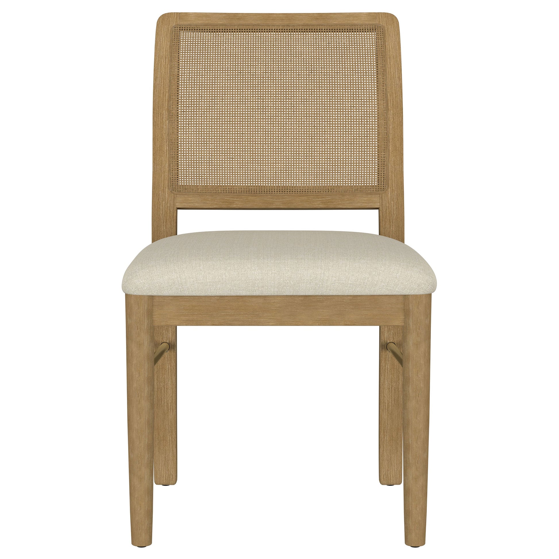 This dining chair combines modern comfort with organic charm, featuring a handwoven cane backrest crafted in Indonesia for a natural, textured appeal. The solid Asian hardwood frame, accented by white ash veneer, provides durability and a warm aesthetic, while a beige linen-like upholstered cushion enhances its cozy style. Pirelli webbed seat construction ensures both comfort and lasting support. Reinforced with a sleek metal stretcher bar, this chair balances beauty and functionality.