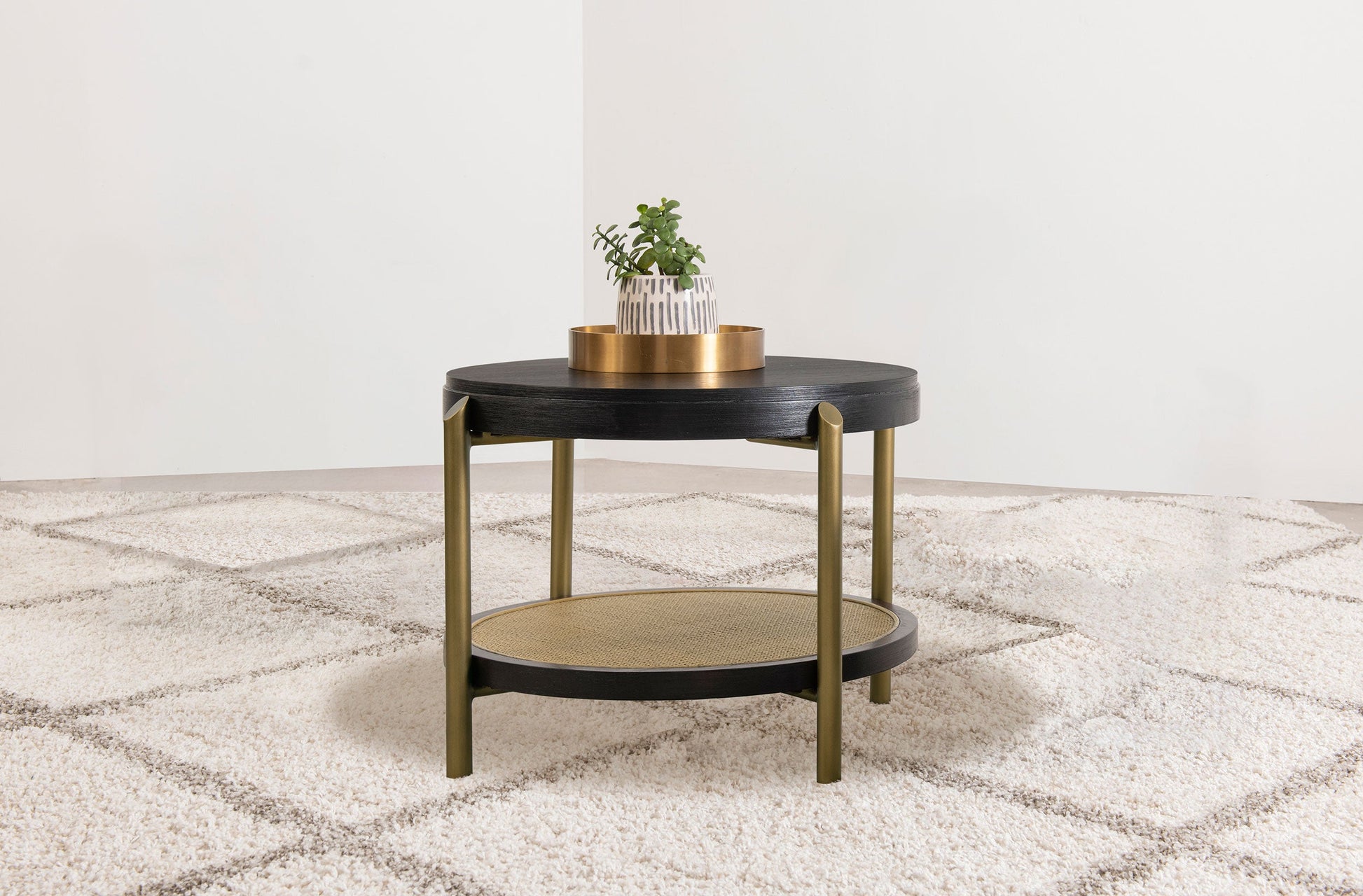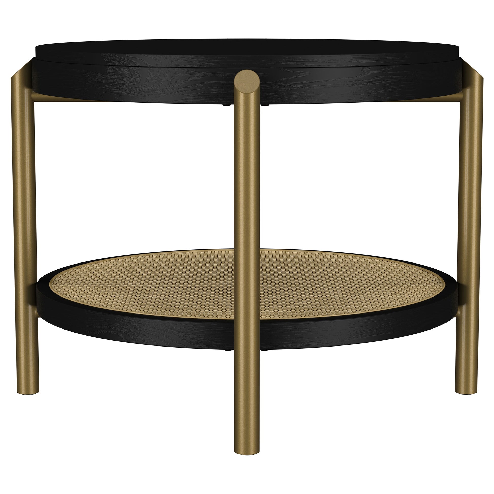 This round end table showcases a refined blend of natural and industrial elements, perfect for modern interiors. Crafted from Asian hardwood, engineered wood, and ash veneer, its finish highlights the table's organic grain for a subtle, rustic appeal. The lower shelf features natural woven rattan, offering functional storage with a stylish touch. Sturdy aged brass-finished metal legs provide contrast and durability. Ideal as a side table or accent piece, it combines elegance and utility effortlessly.
